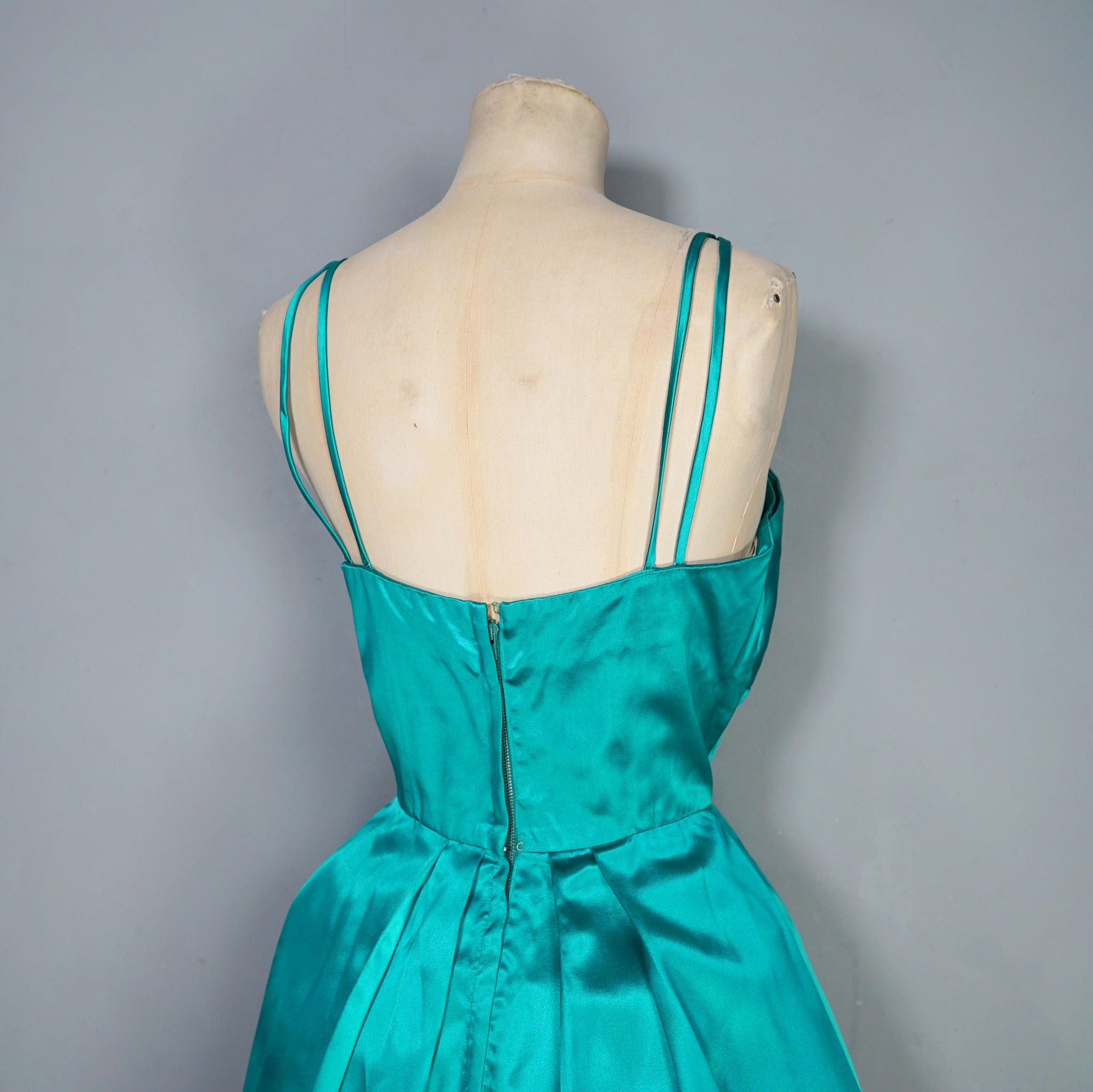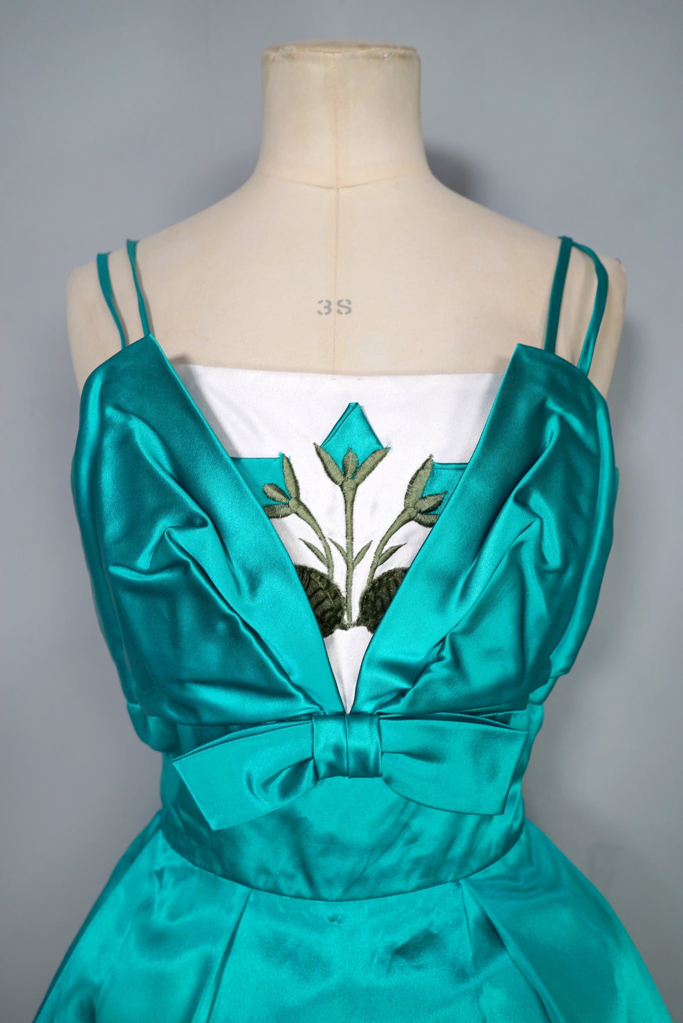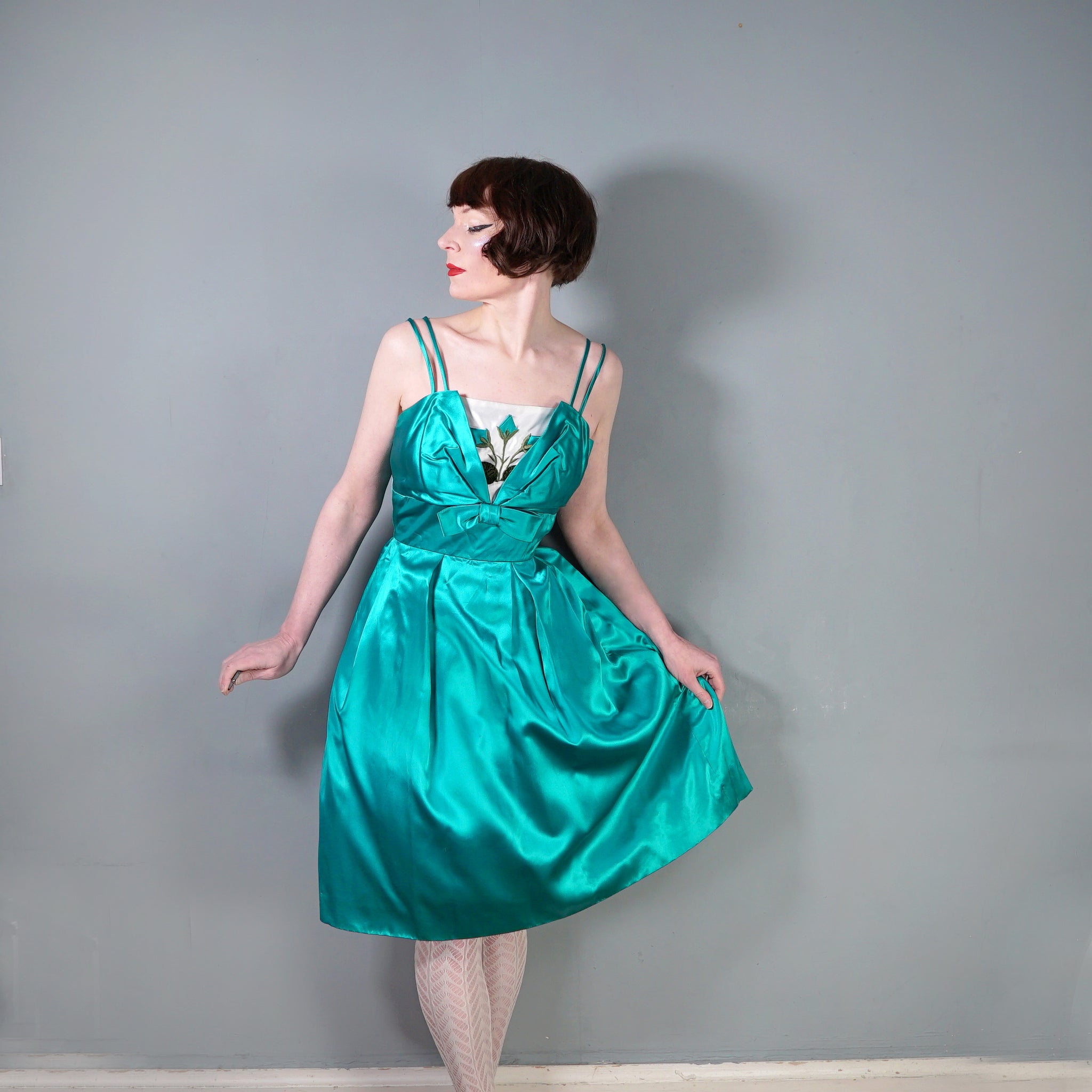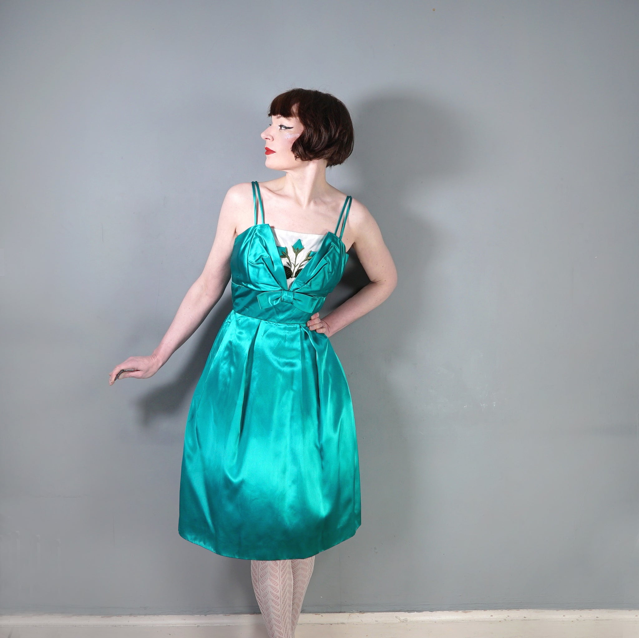 Fun little 60s cocktail dress by Blanes, London. Lovely jade green satin with a beautiful layered bust with overlaying pleated bust folds and a white back panel with an embroidered and appliqued floral tulip motif. Twin spaghetti straps to the shoulders and a fitted shelfy underbust with light boning. Large bow to the underbust. Waist is fitted and skirt is moderstly full, sewn in very wide box pleats. Back metal zipper to fasten. Bodice is lined and the skirt is backed in acetate to hold the shape beautifully.