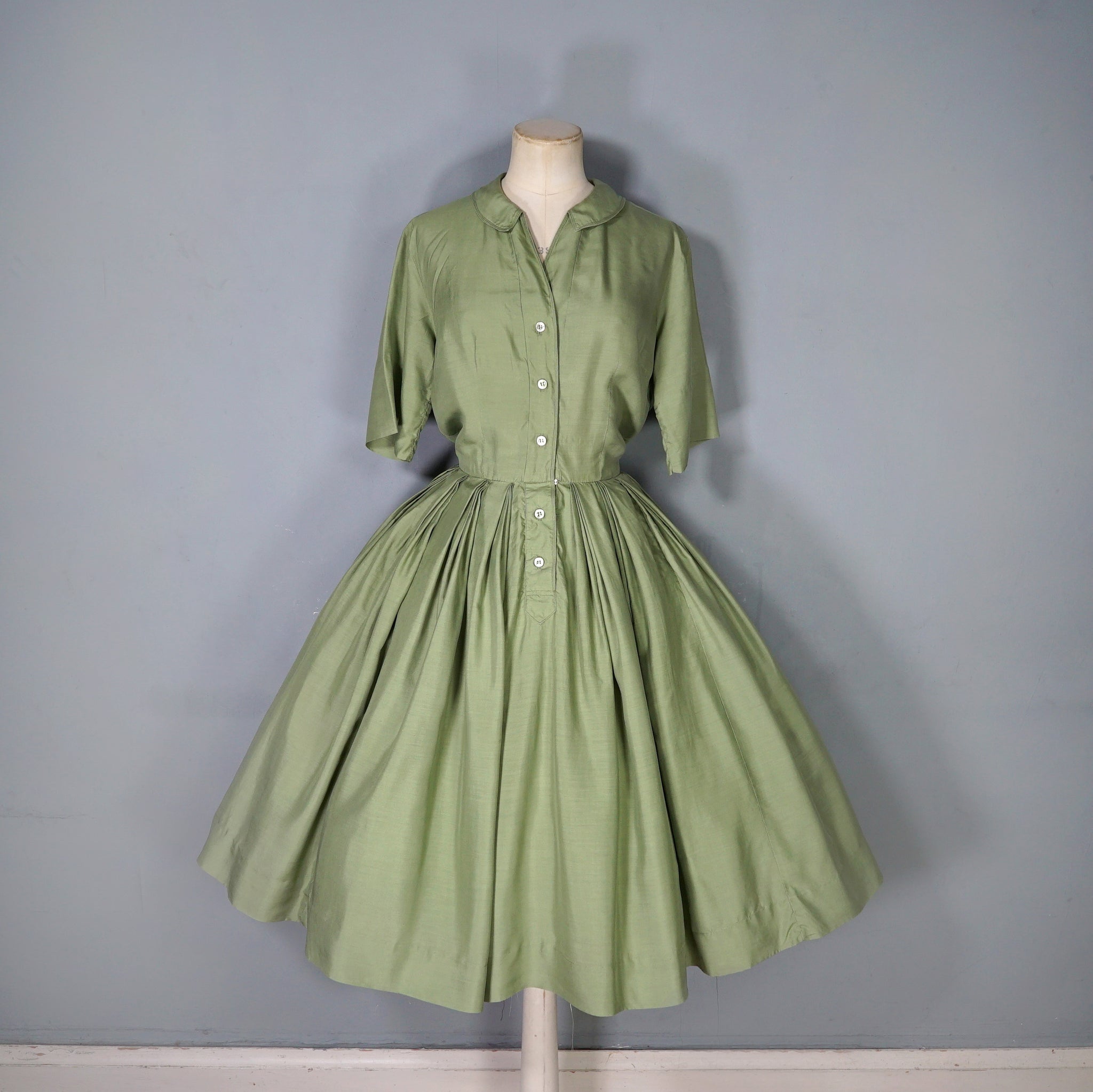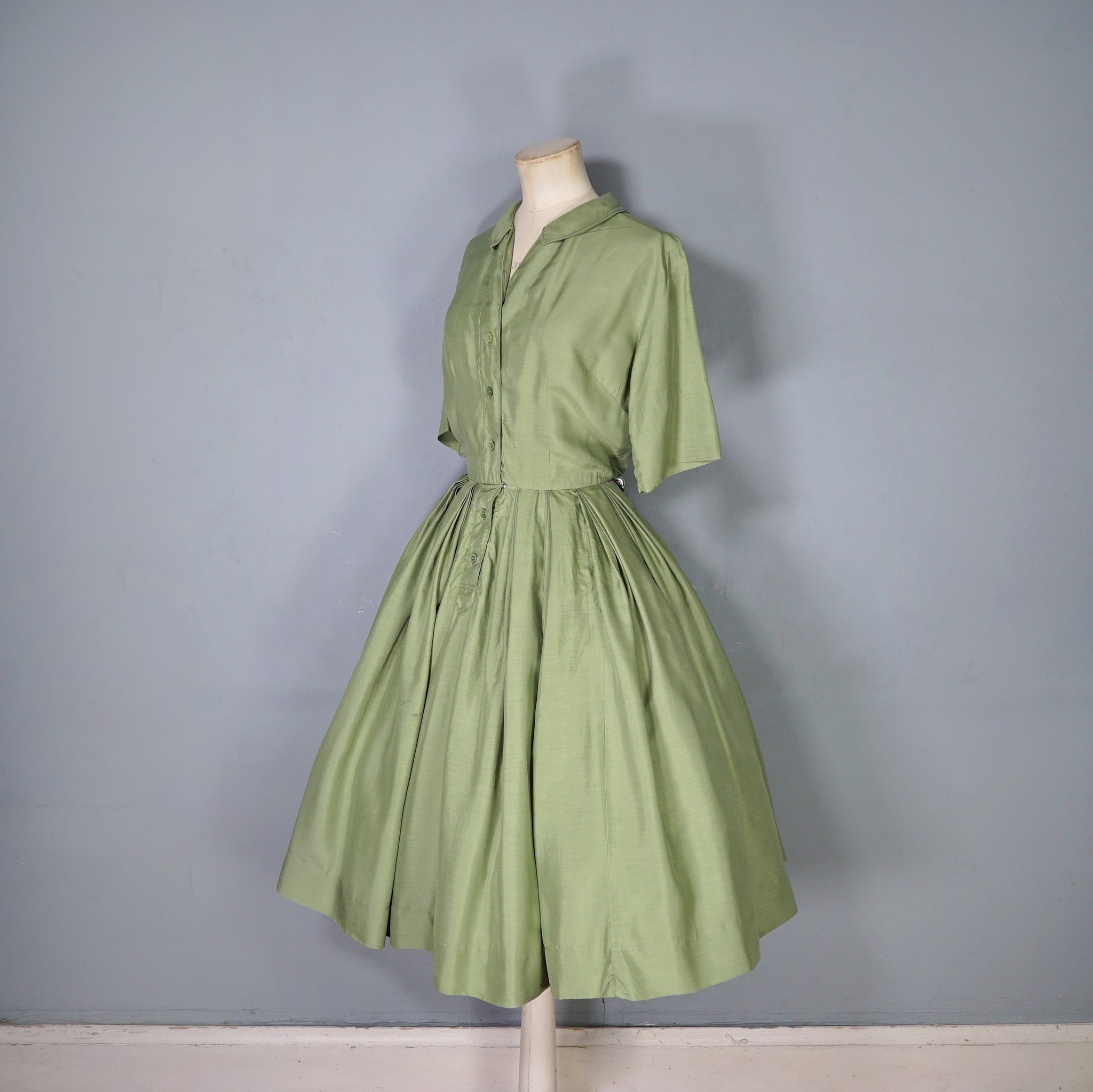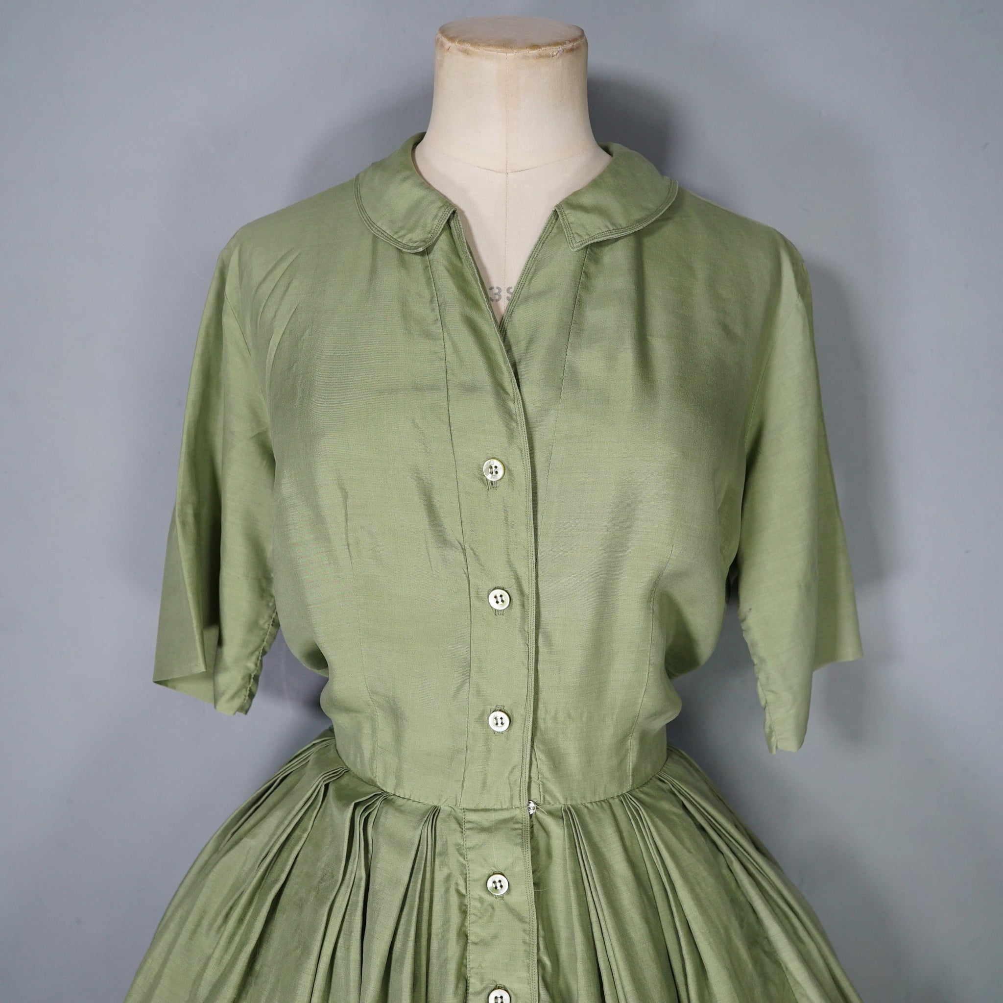 Softest and lightest pure silk shirt dress from the late 50s / early 60s in a lovely pale olive green shade. Blousey bodice with short sleeves and a v-neck with a slim collar, beautifully made with very neat fine top stitching. Front placket buttons with five small buttons, with an additional hidden popper to secure the waist. Very full skirt sewn in elegant triple folded box pleats. Midi length.