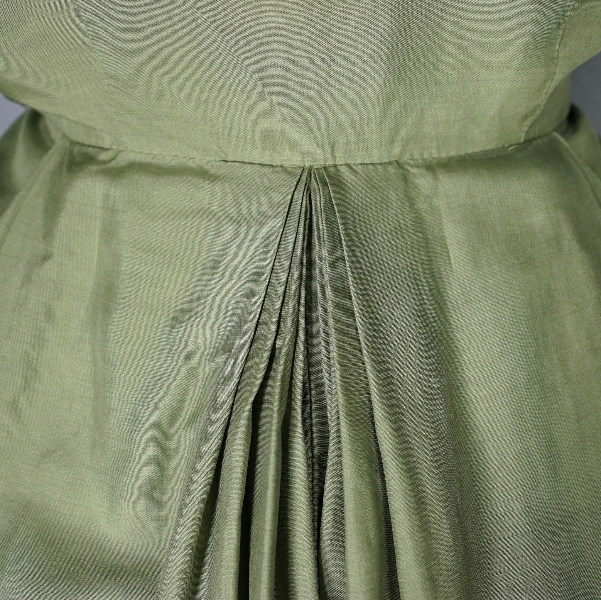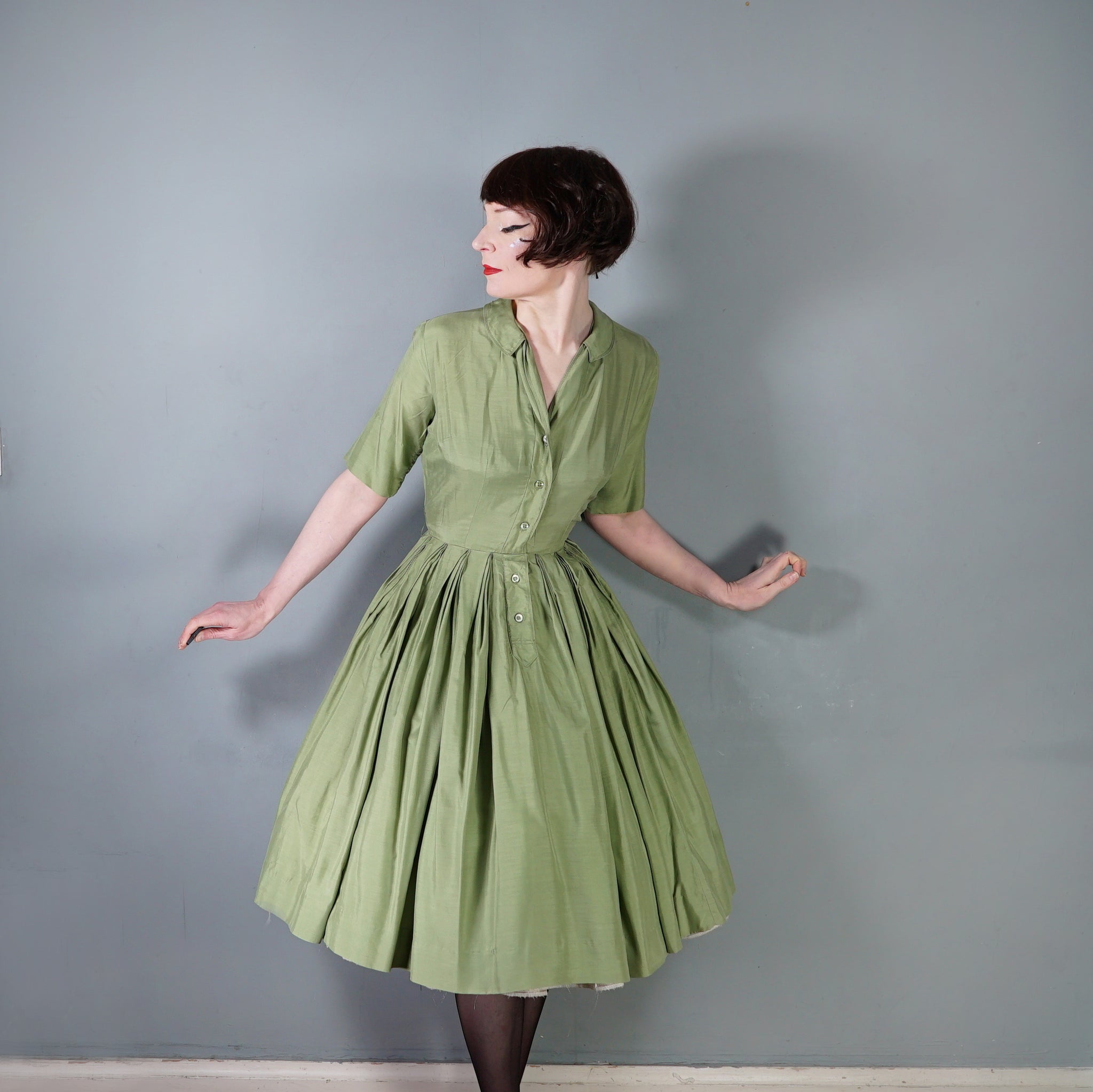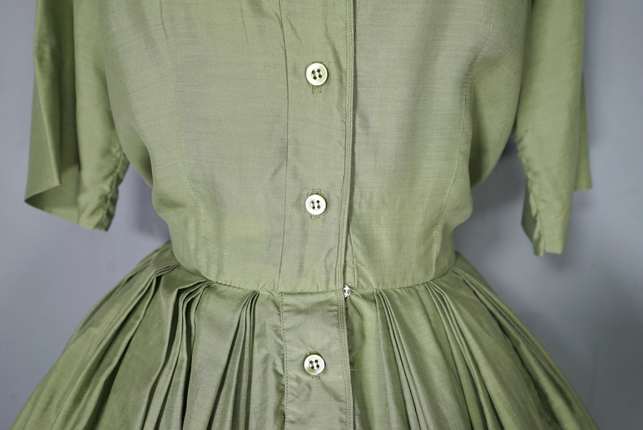 Softest and lightest pure silk shirt dress from the late 50s / early 60s in a lovely pale olive green shade. Blousey bodice with short sleeves and a v-neck with a slim collar, beautifully made with very neat fine top stitching. Front placket buttons with five small buttons, with an additional hidden popper to secure the waist. Very full skirt sewn in elegant triple folded box pleats. Midi length.