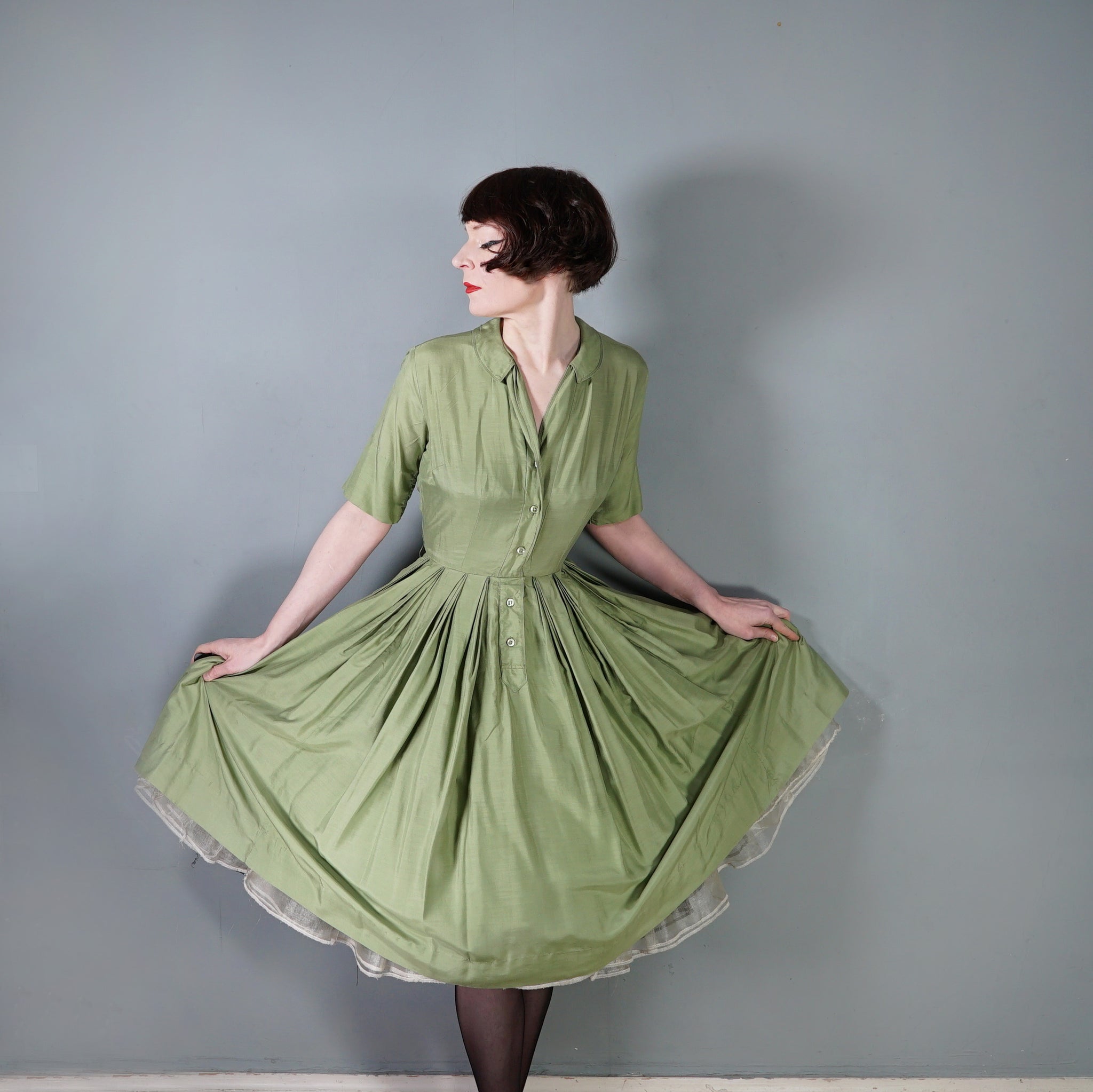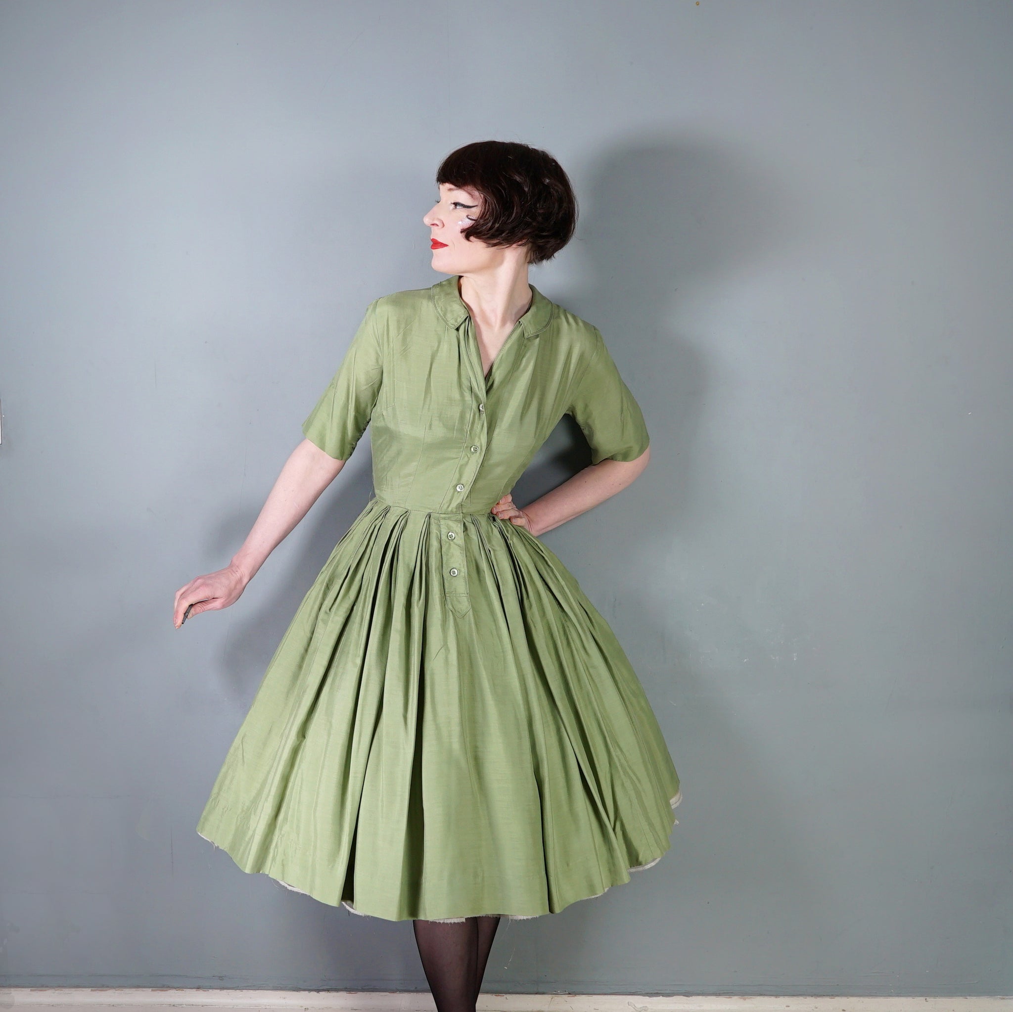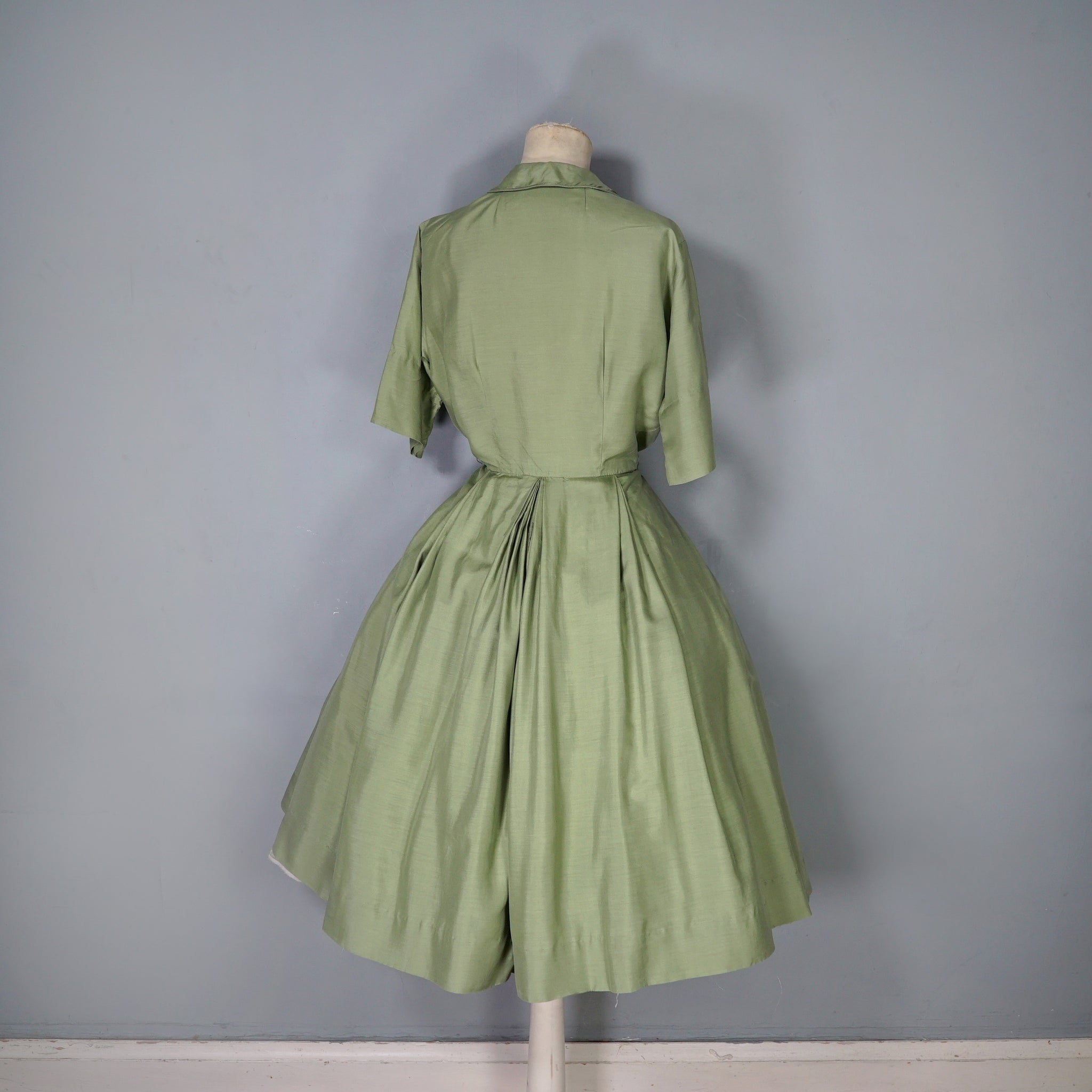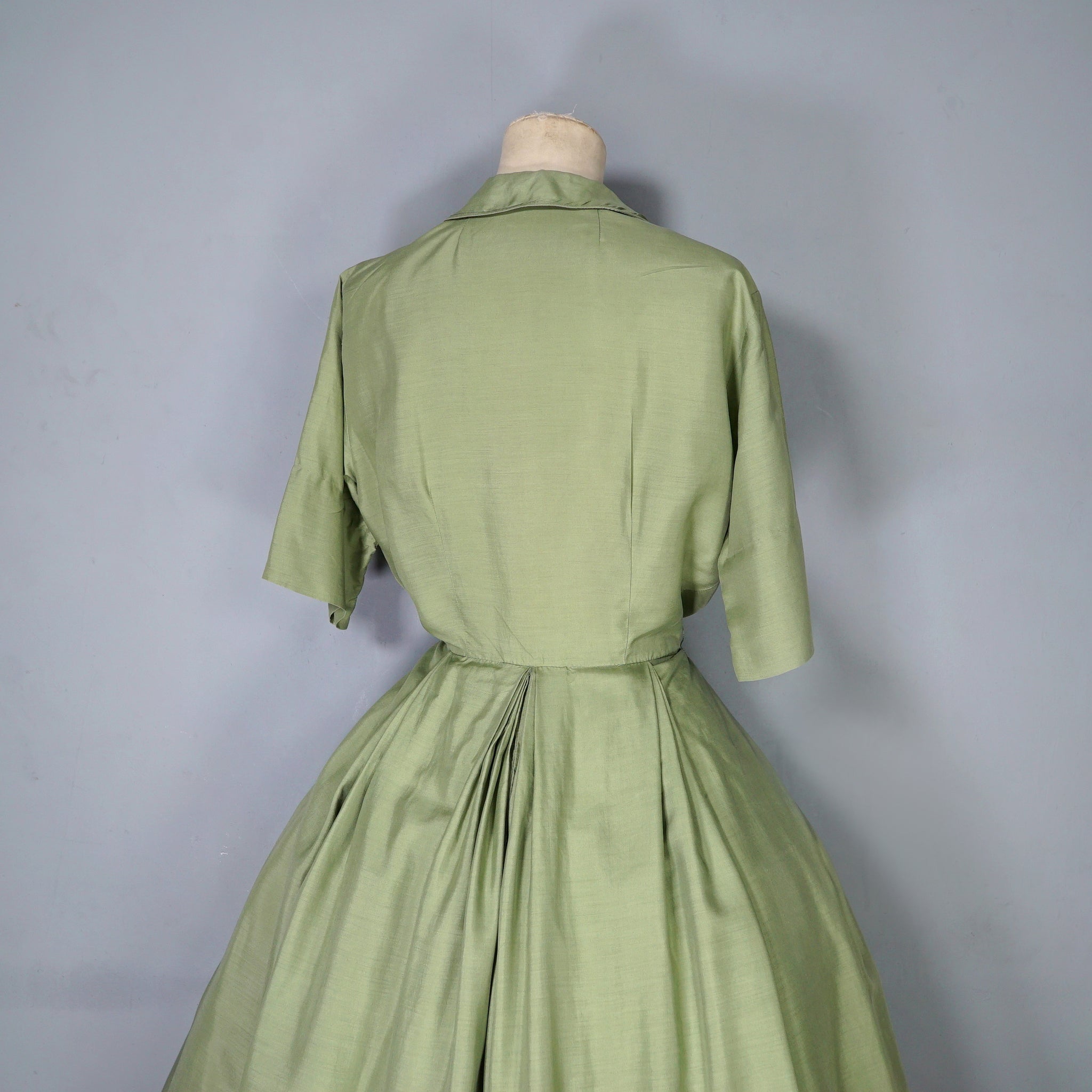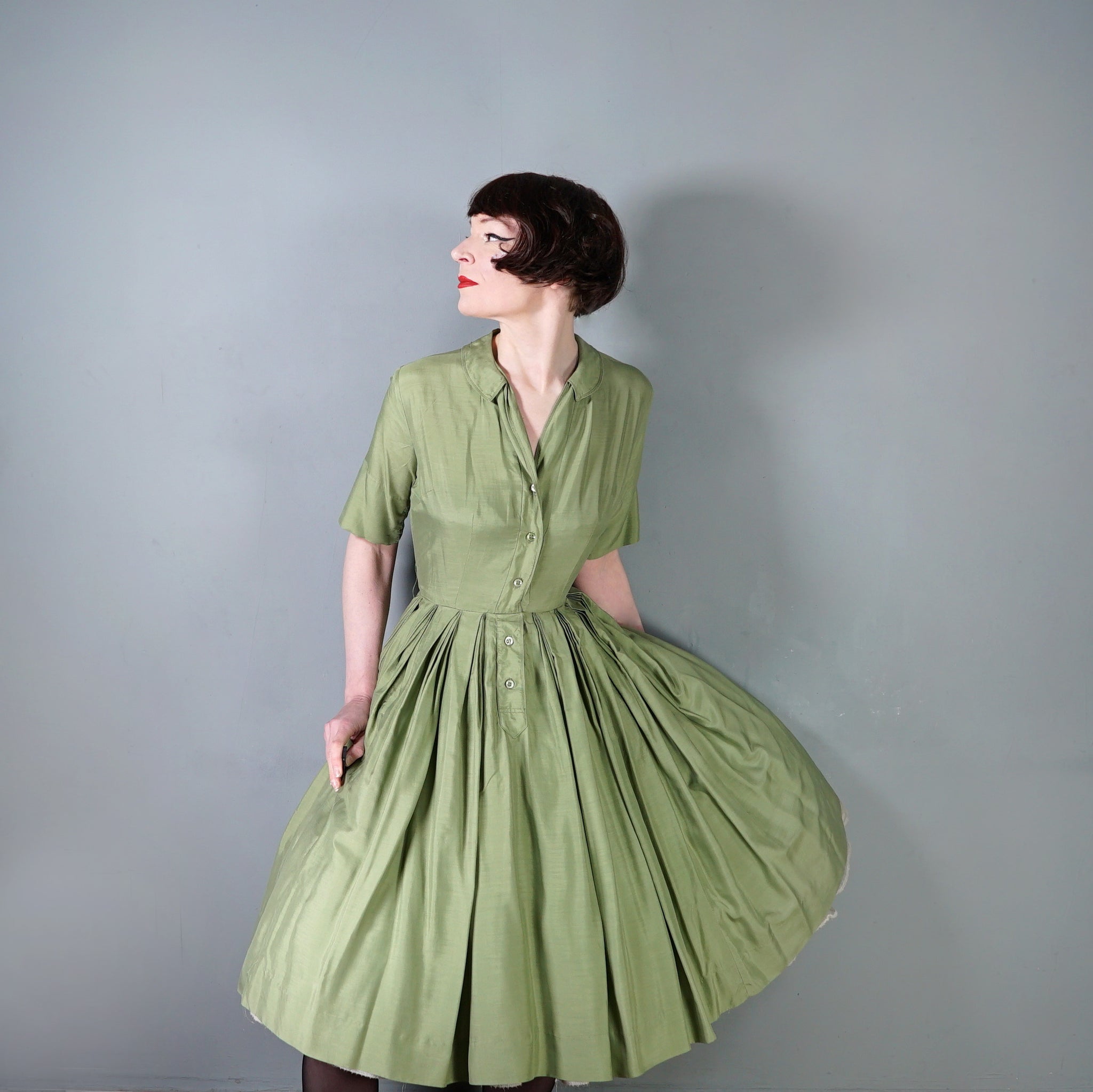 50s 60s OLIVE GREEN PURE SILK FULL SKIRTED SHIRT DRESS - S