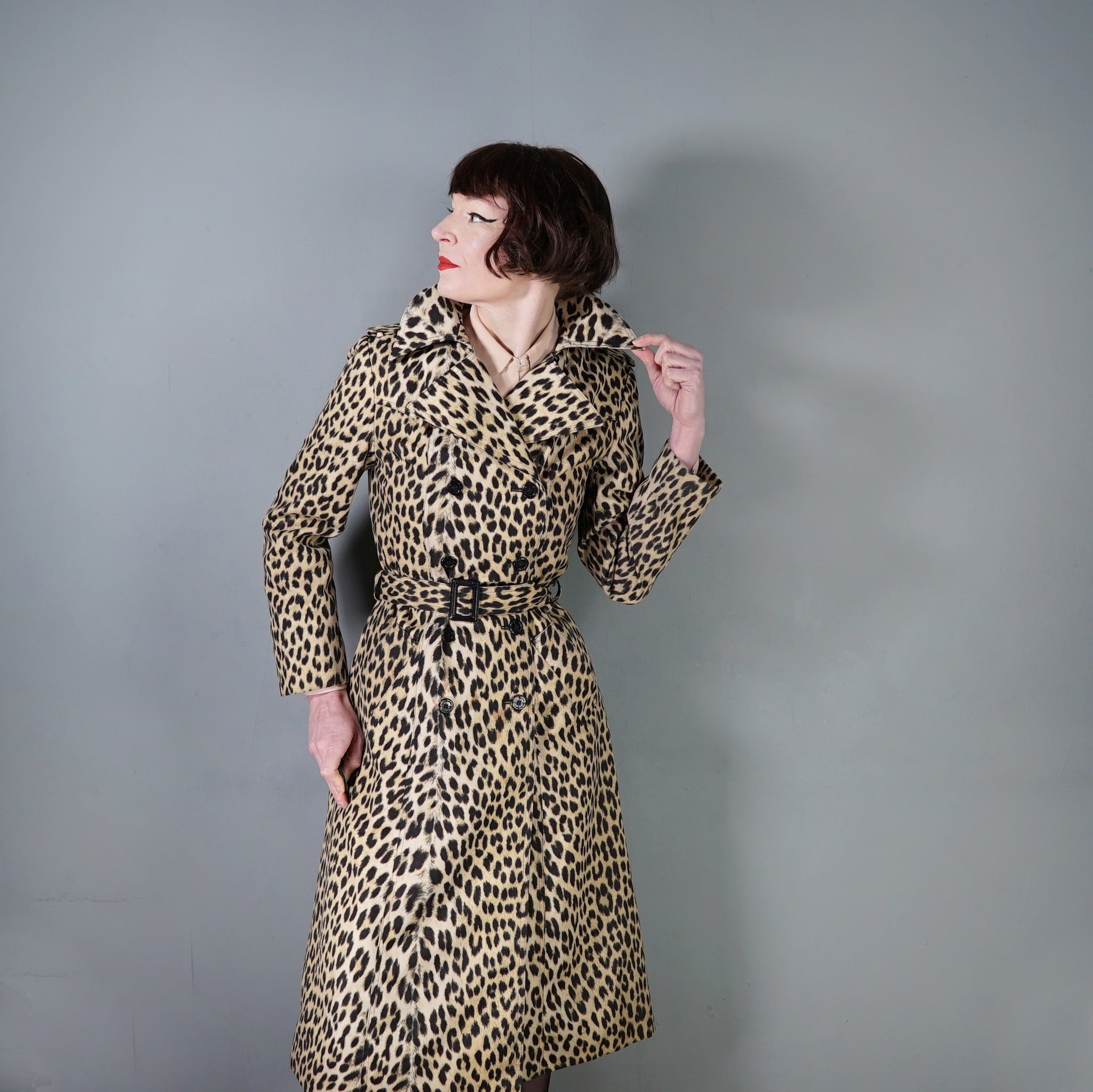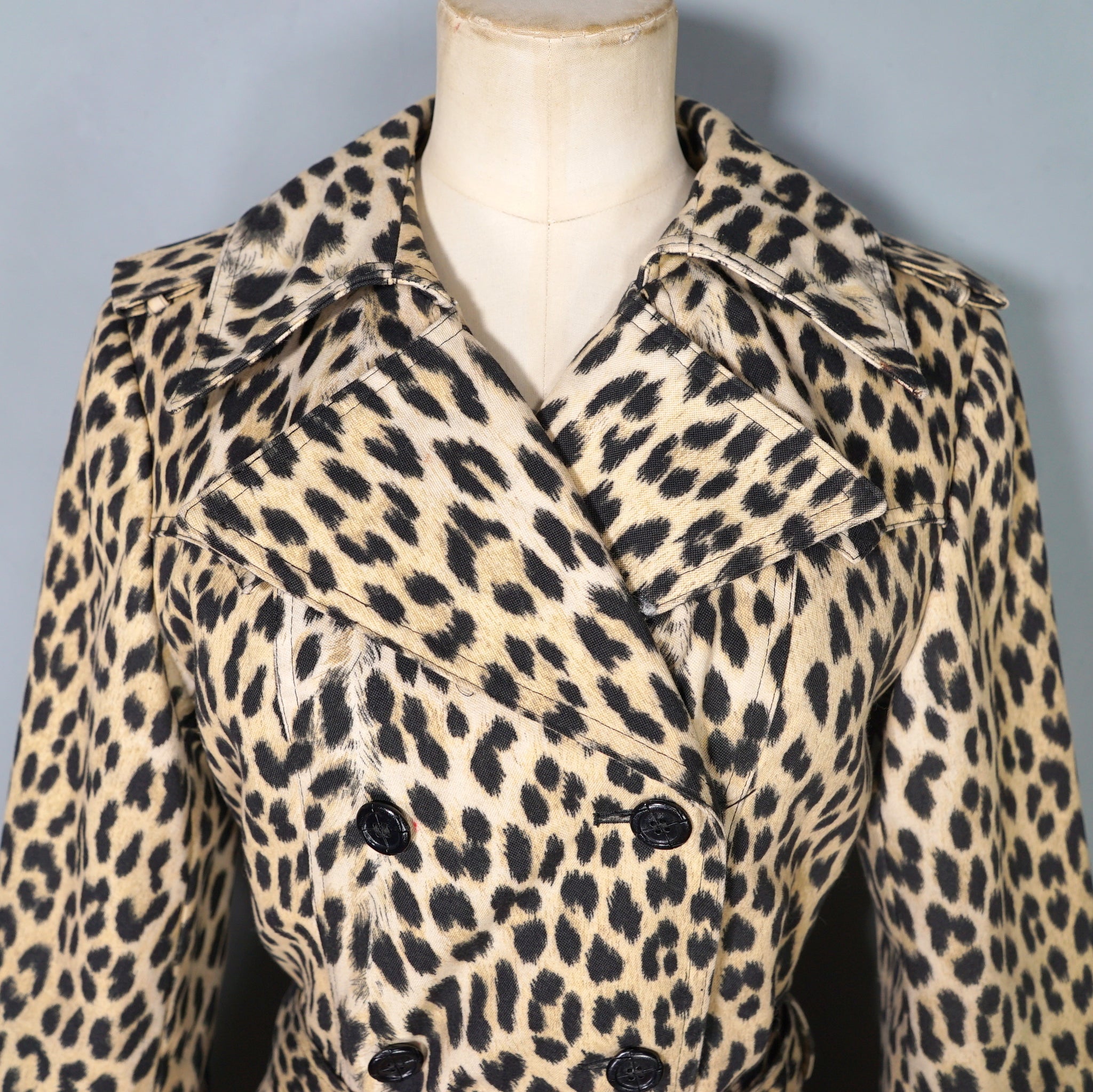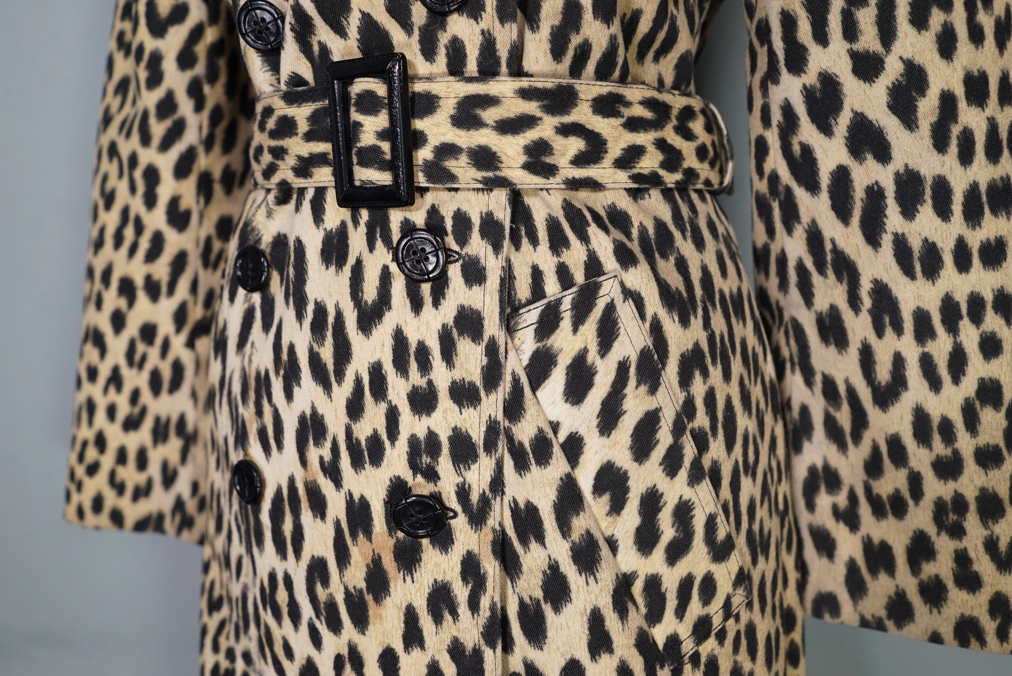 Iconic French leopard print trench coat, unlabeled but looks so much like a Royal Blizzand. Beautiful fabric in a soft beige and black animal print. Double breasted front with eight small black buttons. Big lapels and buttoned shoulder epaulettes. Long sleeves. Fitted waist with matching buckled belt to cinch the silhouette. Slot pockets on the hip. Outer fabric feels like a cotton-polyester blend, lining is labeled as a light polyamide. Really lovely quality,