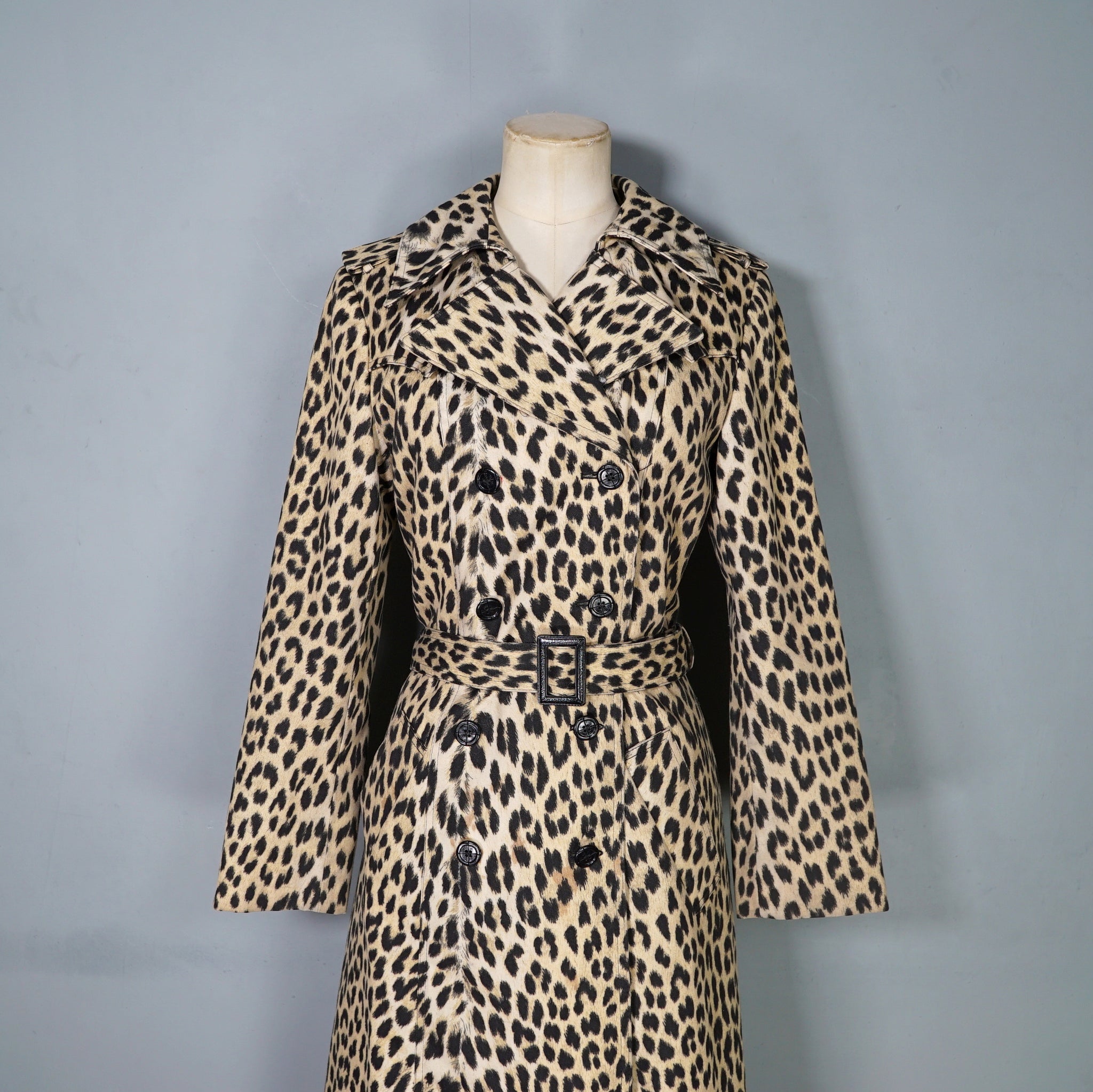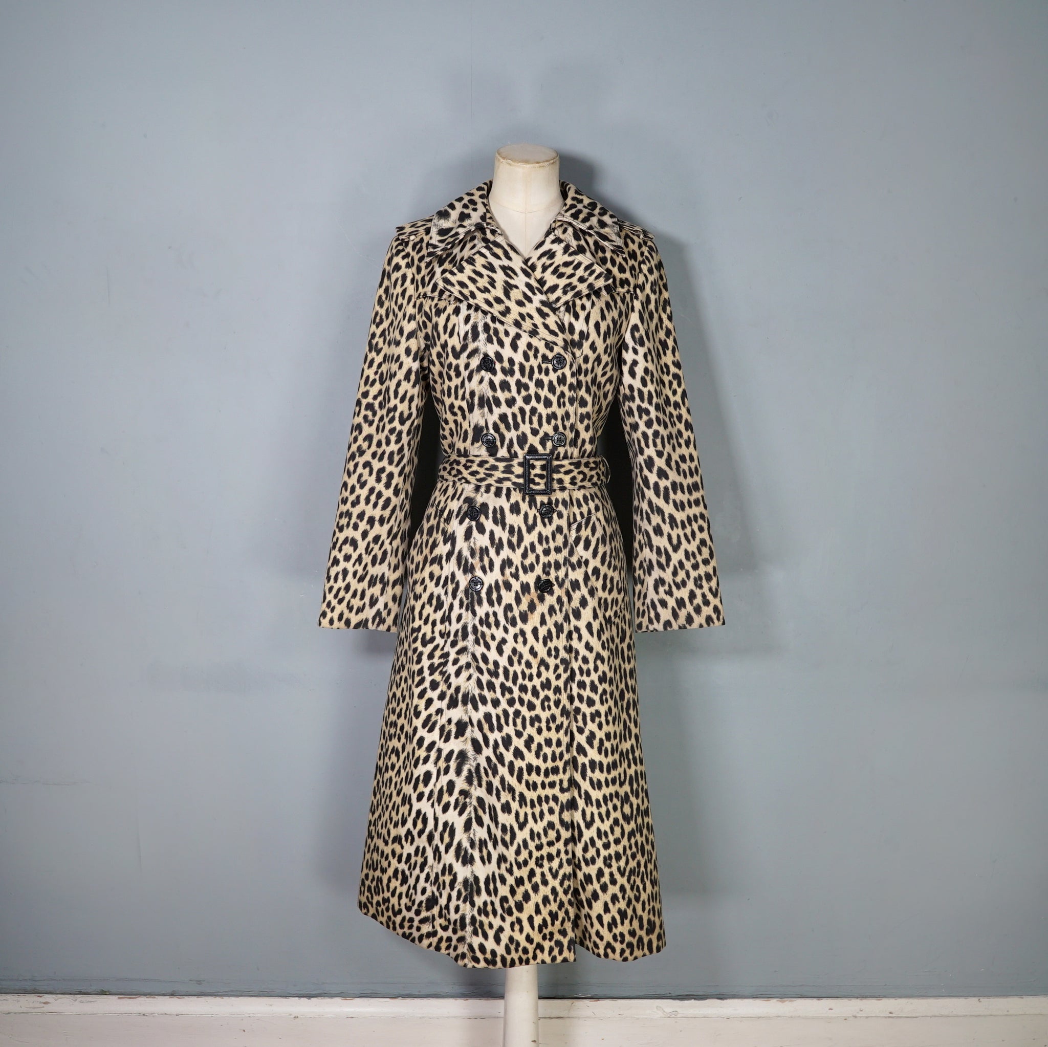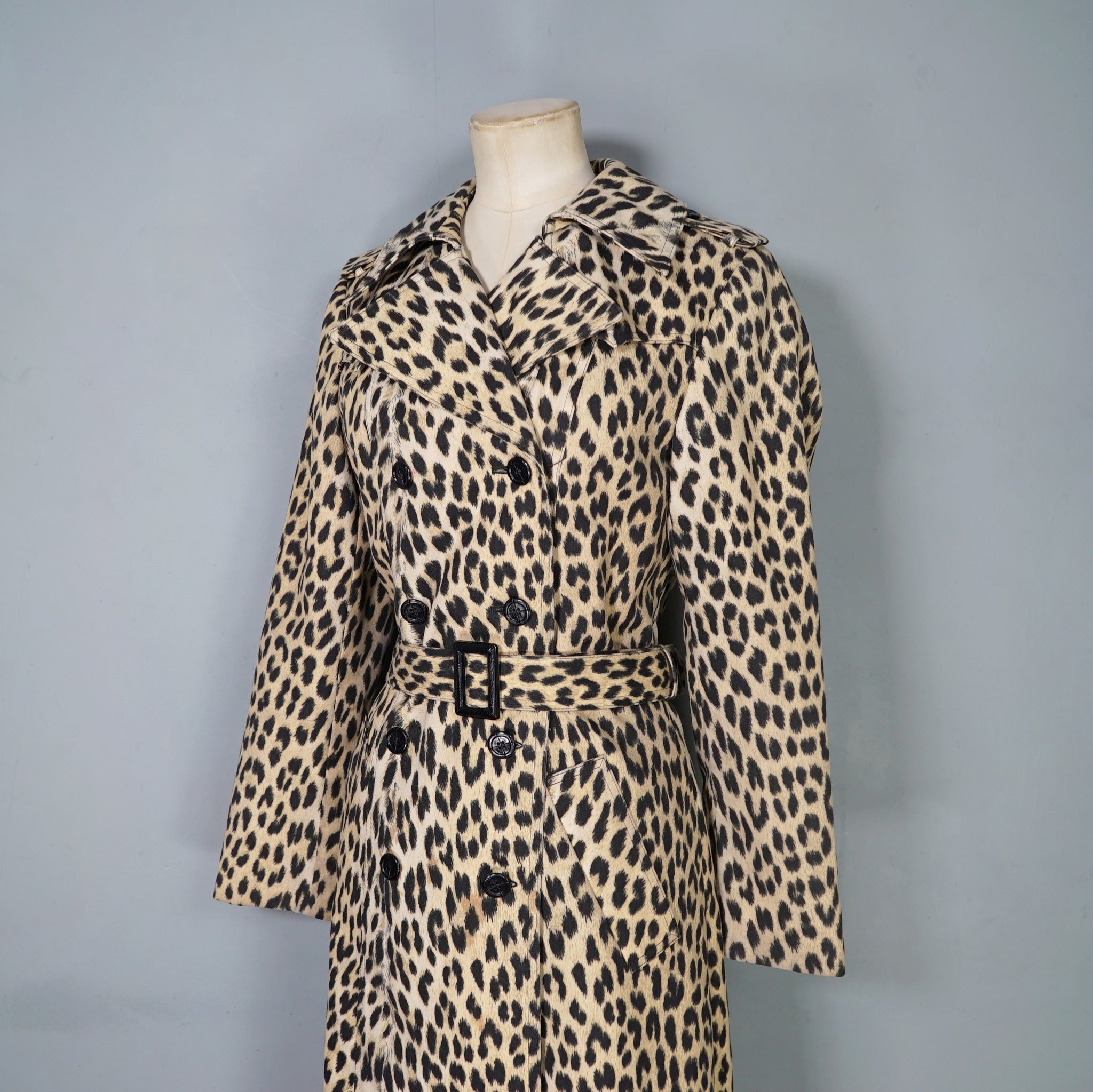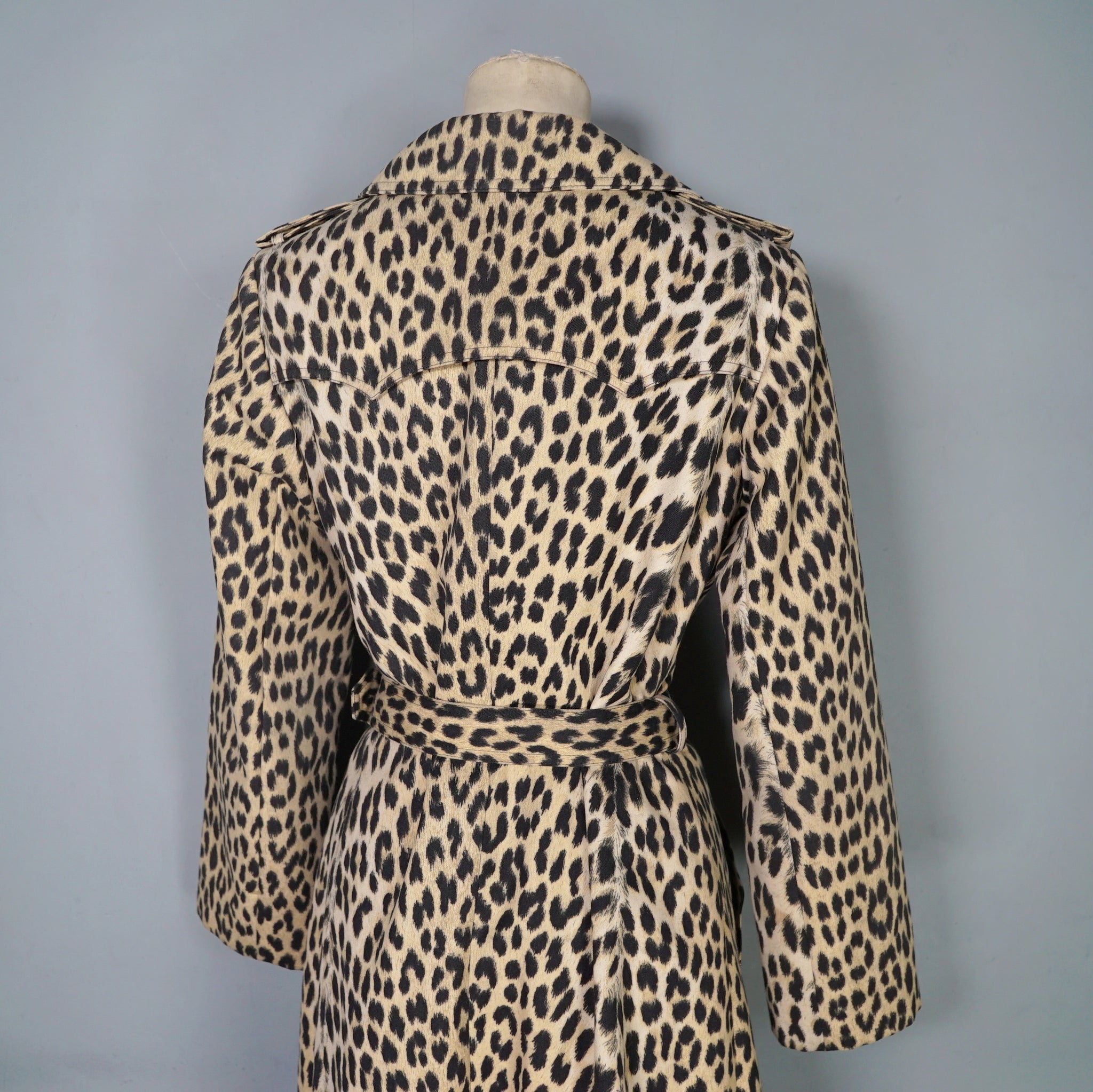 Iconic French leopard print trench coat, unlabeled but looks so much like a Royal Blizzand. Beautiful fabric in a soft beige and black animal print. Double breasted front with eight small black buttons. Big lapels and buttoned shoulder epaulettes. Long sleeves. Fitted waist with matching buckled belt to cinch the silhouette. Slot pockets on the hip. Outer fabric feels like a cotton-polyester blend, lining is labeled as a light polyamide. Really lovely quality,