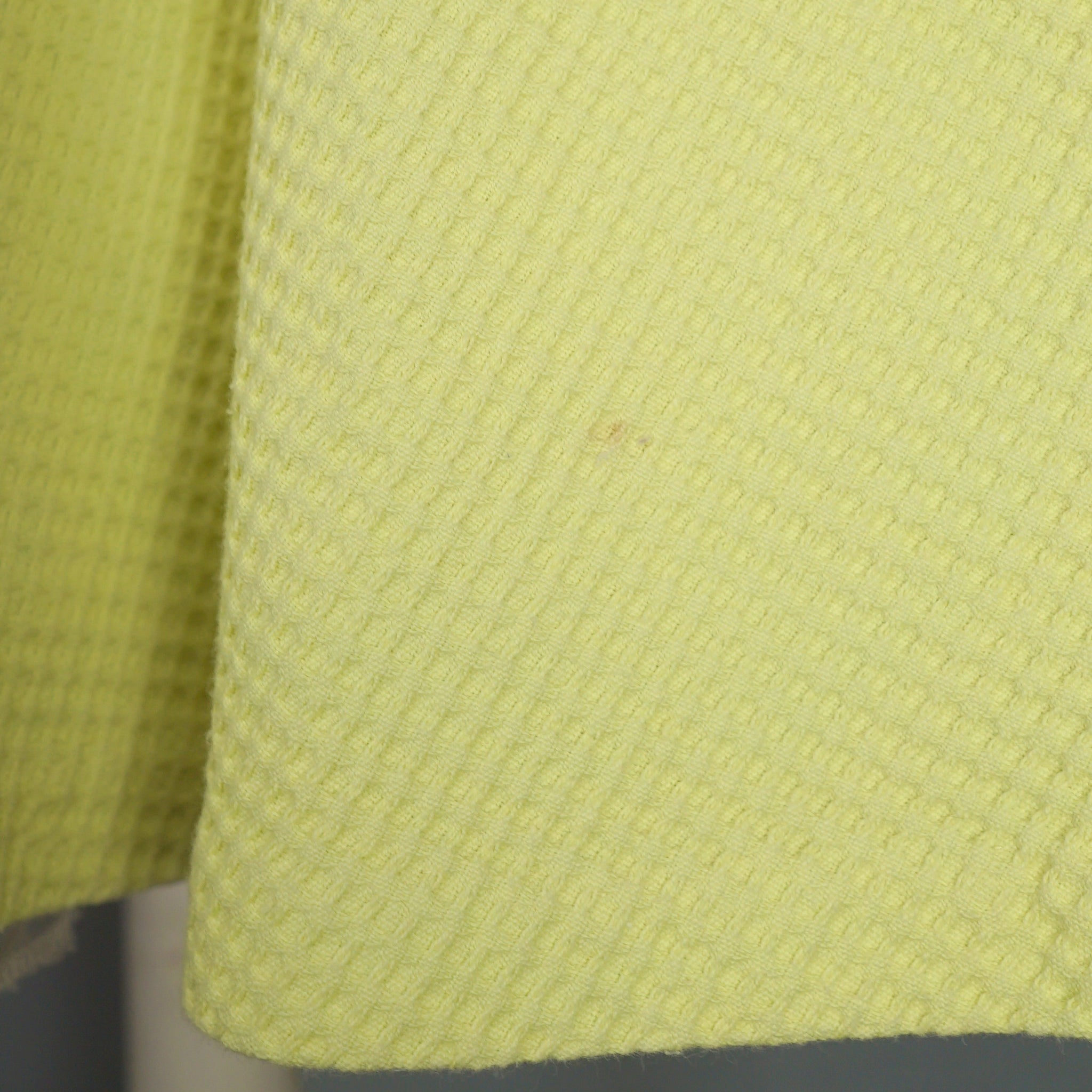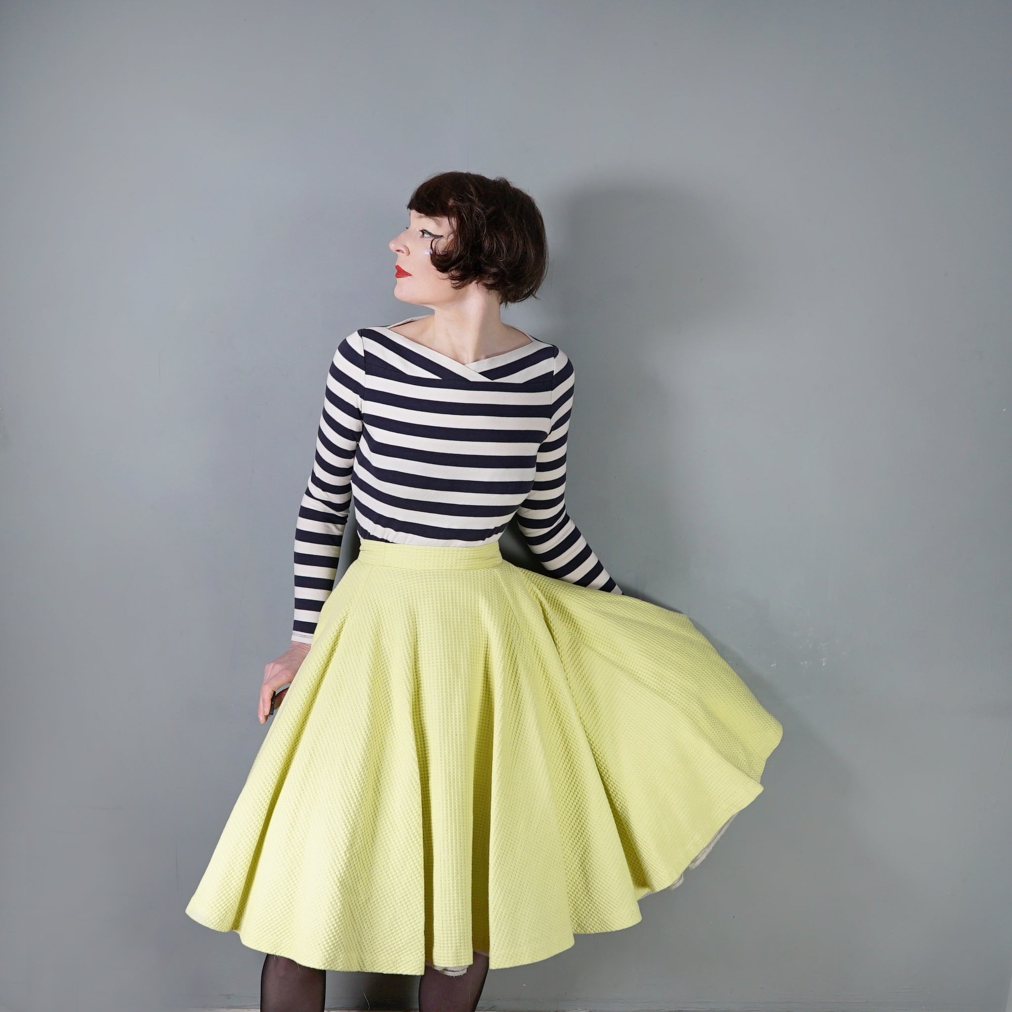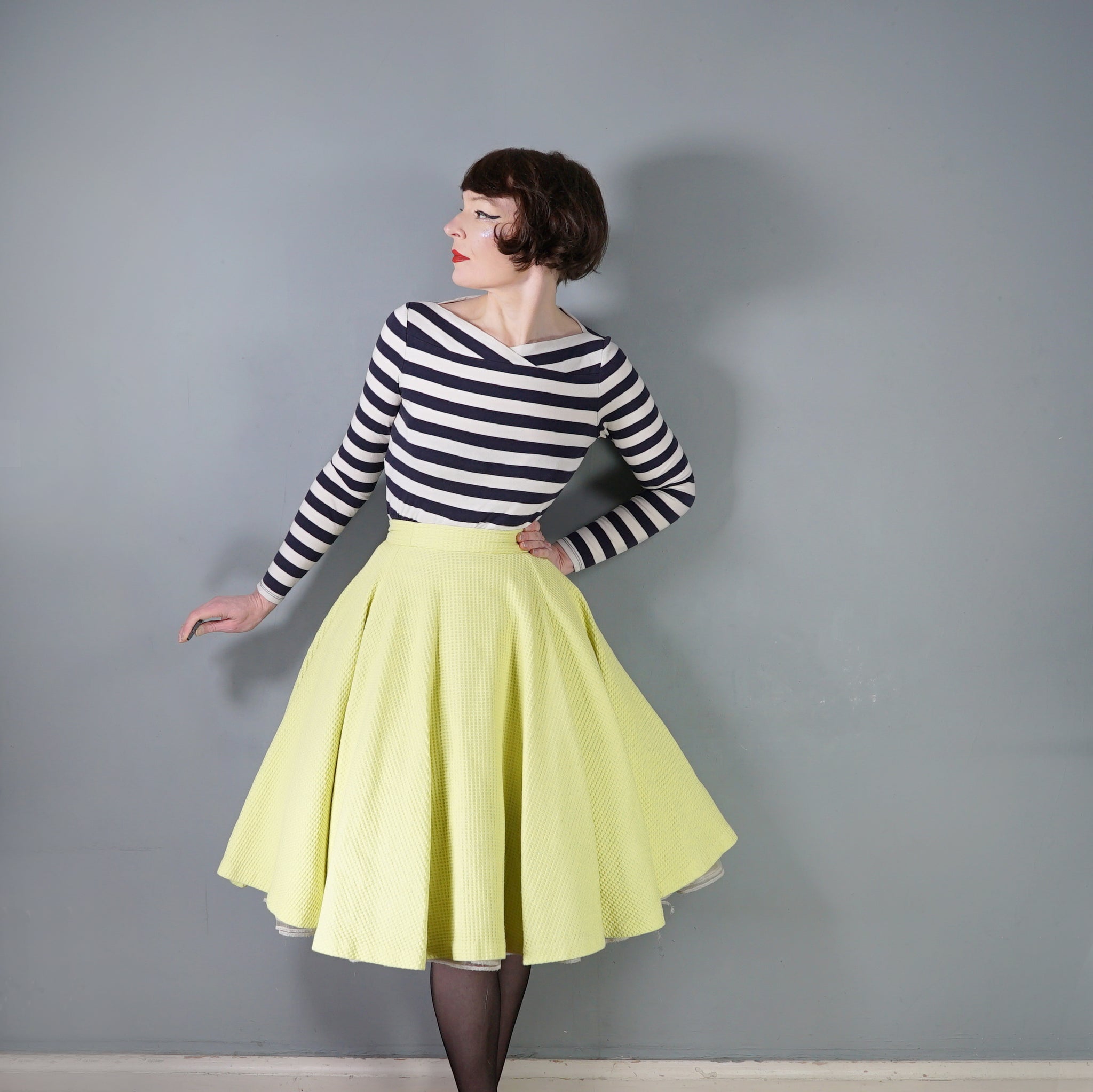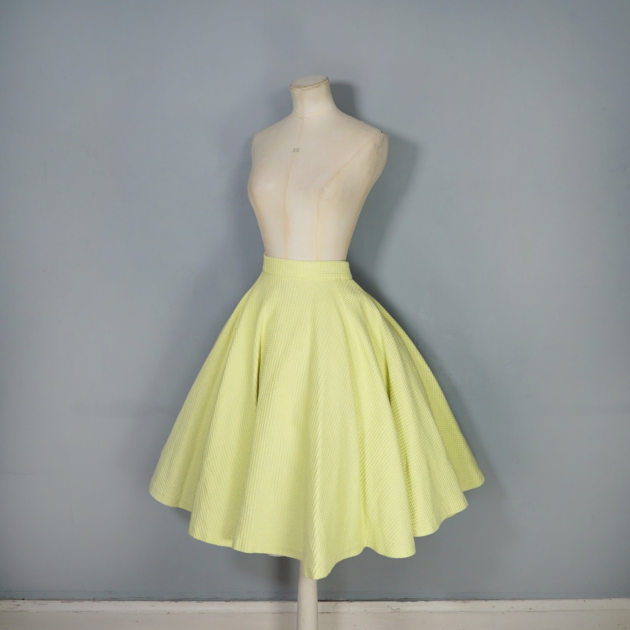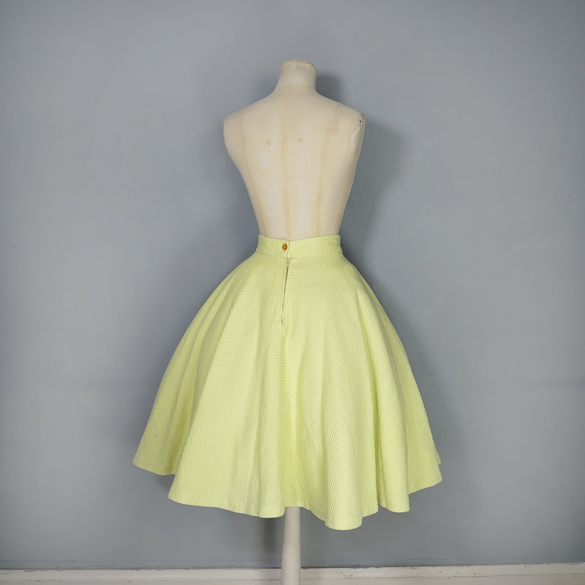 Really fun bright 50s waffle textured cotton skirt in a luminous cold slightly greeny yellow shade. This is a slightly thicker fabric and it's cut in a full circle sweep which makes it hold the shape beautifully when worn with or without a petticoat. High fitted waistband with button and metal zip to fasten. No labels.