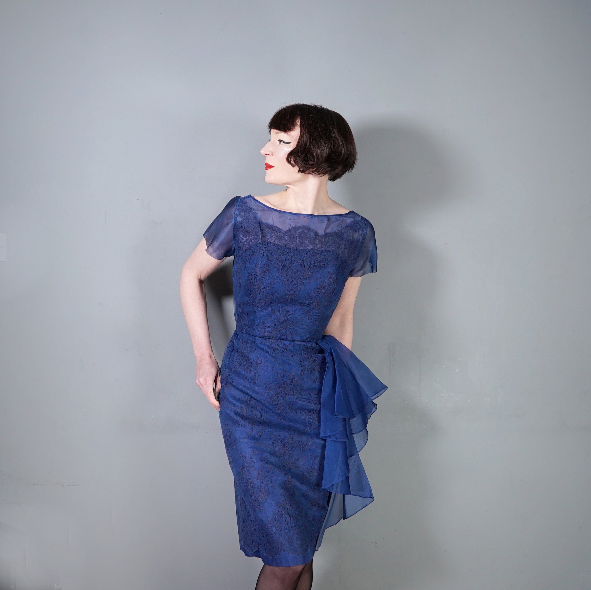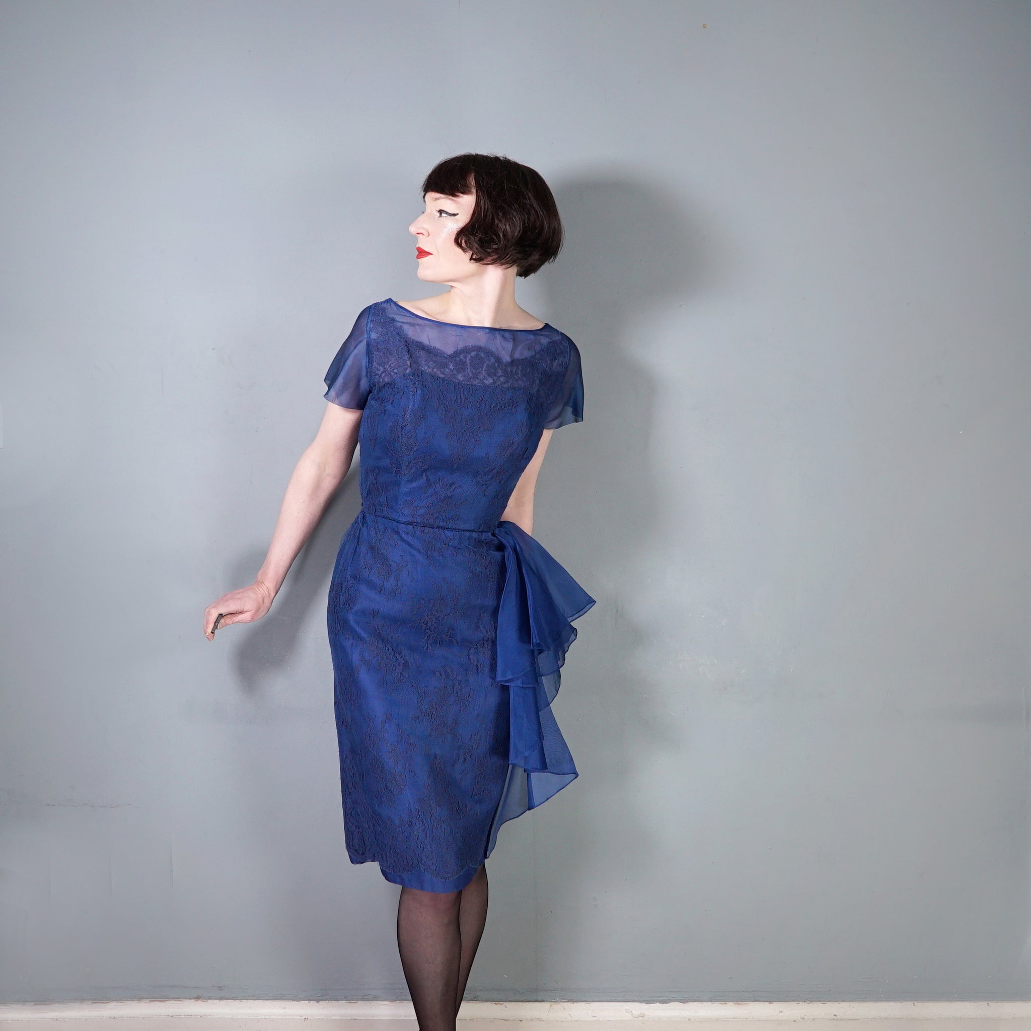 Blue lace cocktail dress by Wakeford, Chelsea. Really beautiful piece, very well made with a built in boned corsetting sweetheart bodice, overlayed with a blue viscose backed chiffon and an outer sheer floral lace. The fit is amazing with a wide rounded neck in front and a low plunging v-back. Back of bodice has the lace/chiffon fabric overlapping at the waist and fastened with tiny popper buttons and hooks. Short sheer chiffon sleevs. Nipped in waistline and straight cut skirt with a chic waterfall chiffon hip drape to one side. Back metal zipper to skirt. So elegant.
