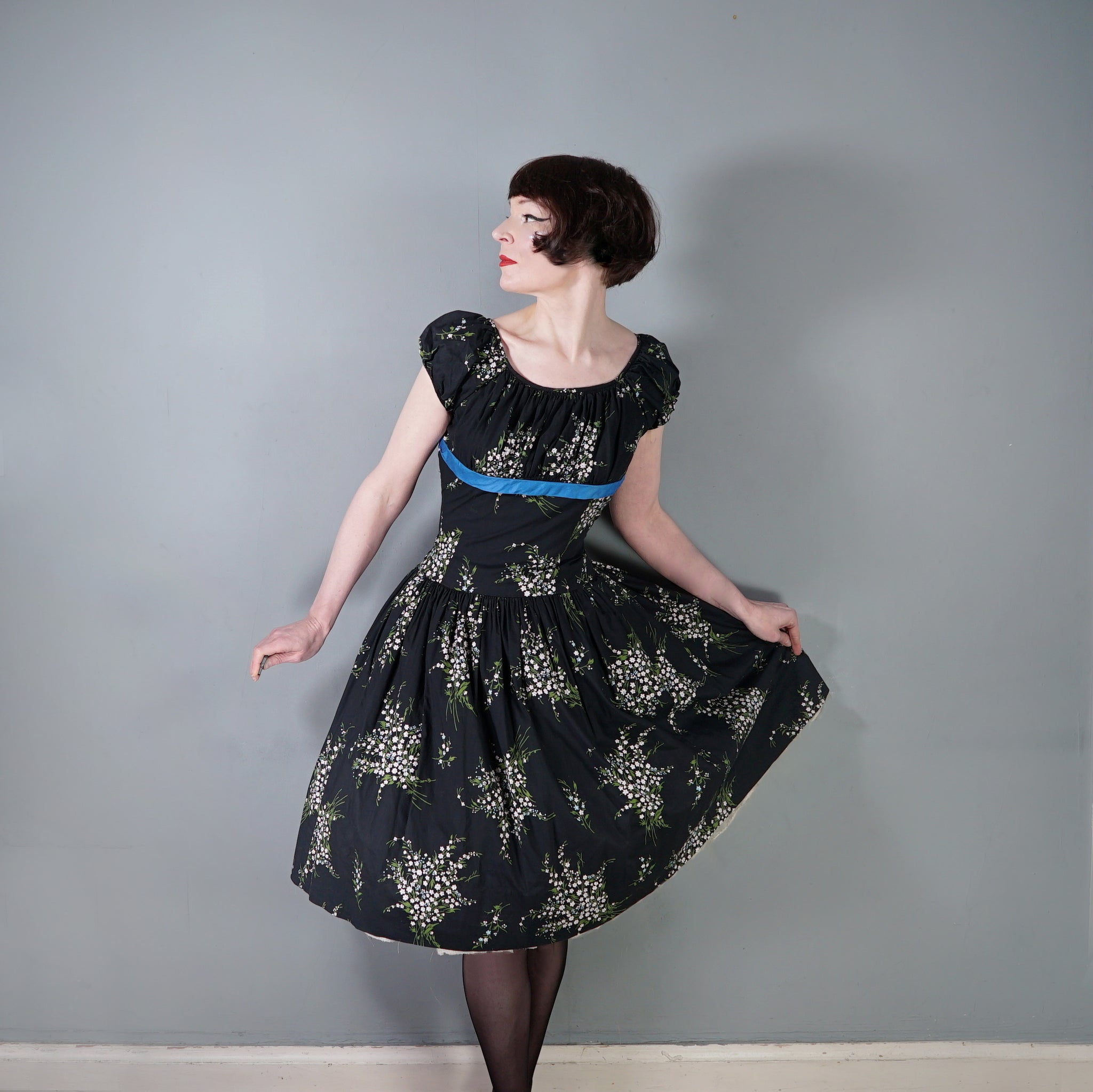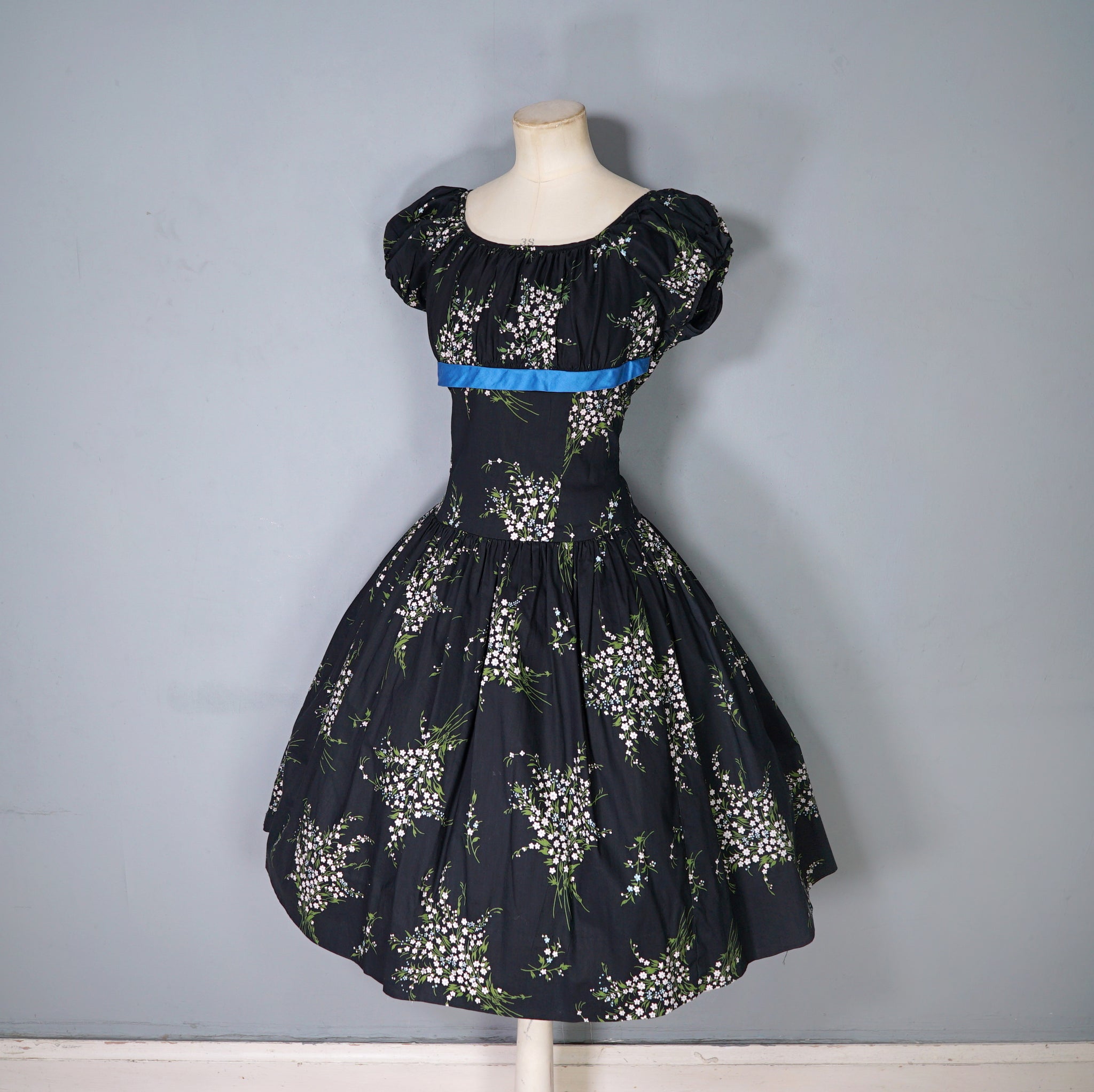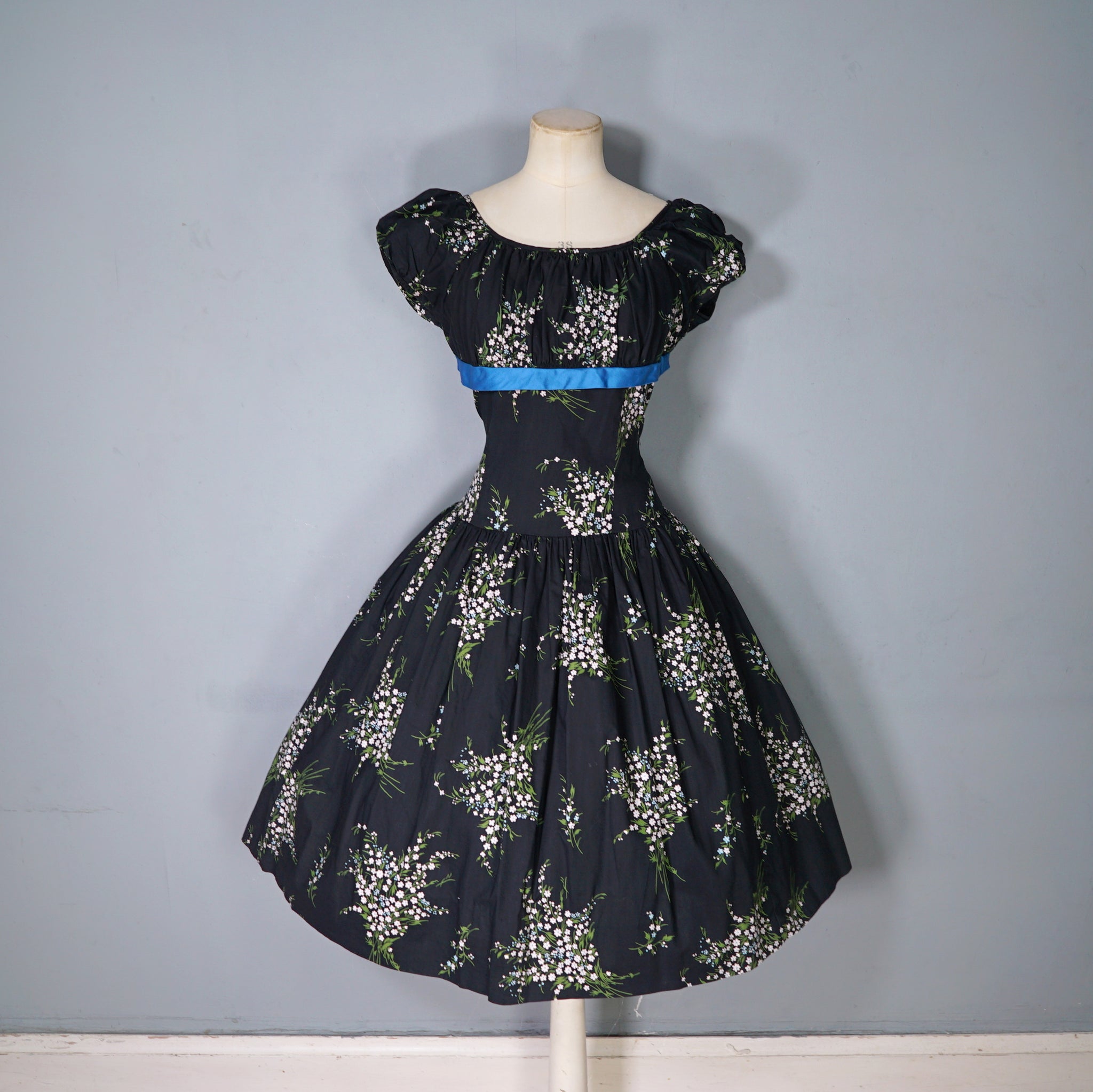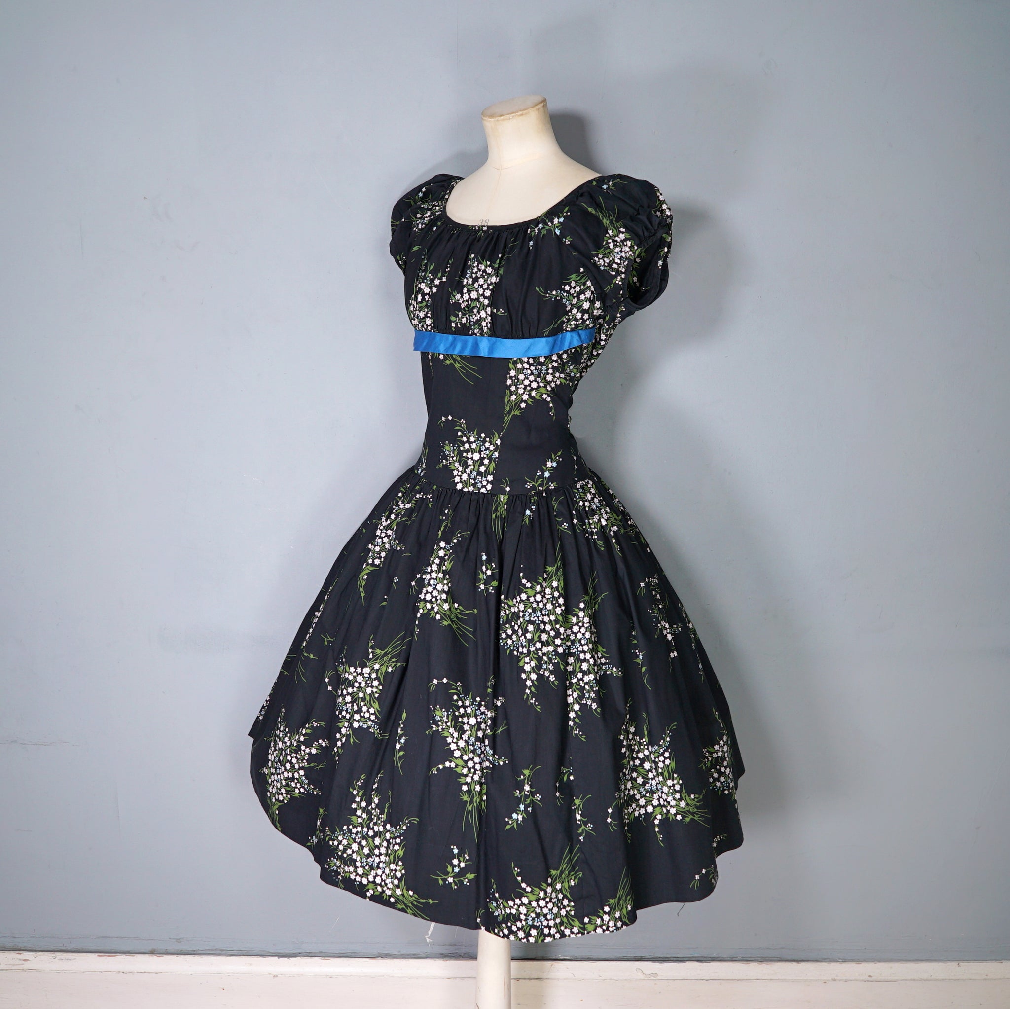 Wonderful 50s dark floral cotton dress by Betty Lo. Somewhere inbetween a day dress and a party dress, in a scattered floral print of small white flower bunches. Elegant silhouette with a high empire bust with soft gathers for a flattering fullness. This is finished with a blue cotton sateen underbust band. Short slightly puffed sleeve and a scooped U-neckline. Drop waisted bodice with a full skirt that falls in lavish gathers from the upper hip down with a generous midi length and swishy full sweep. Back metal zipper to fasten. Dress is unlined.