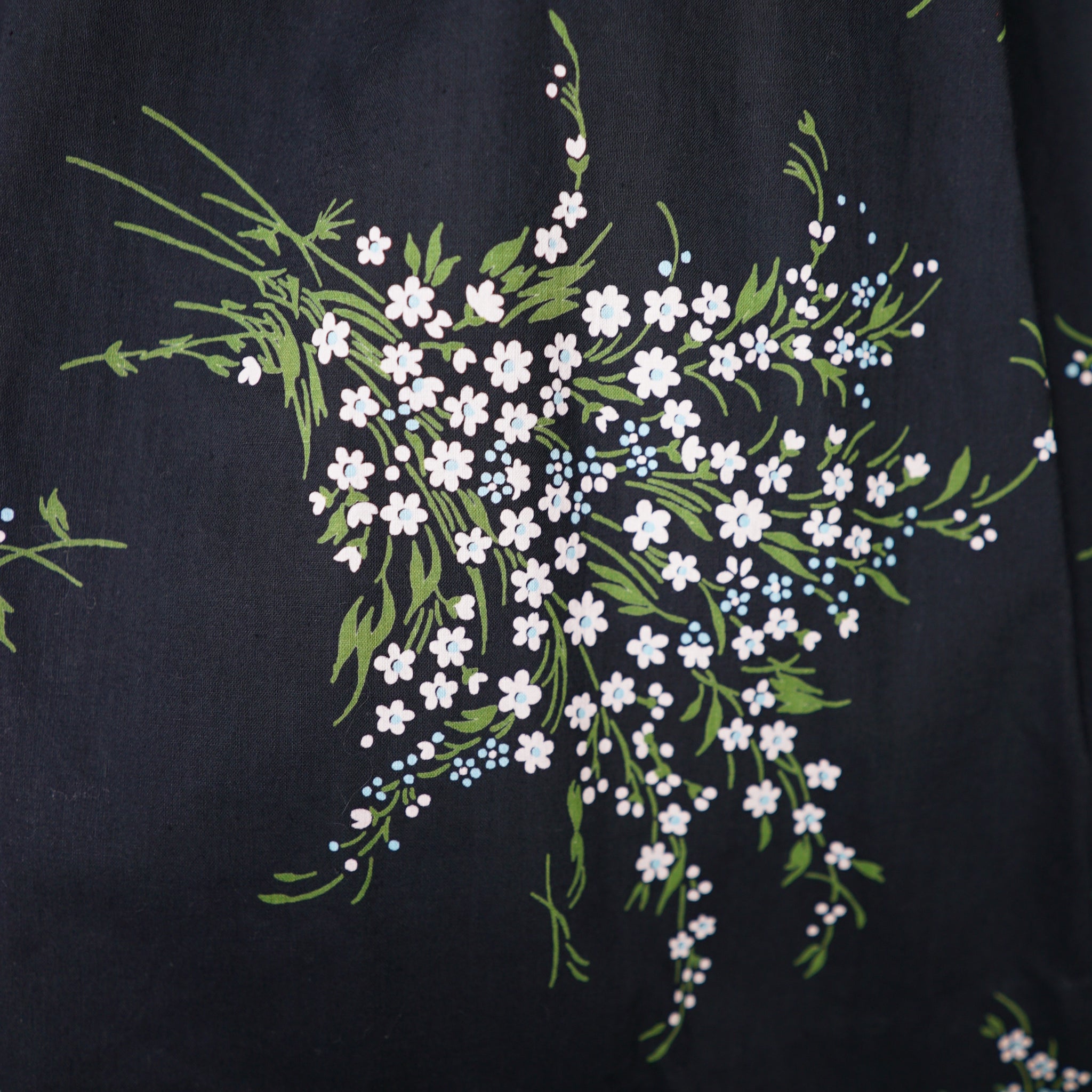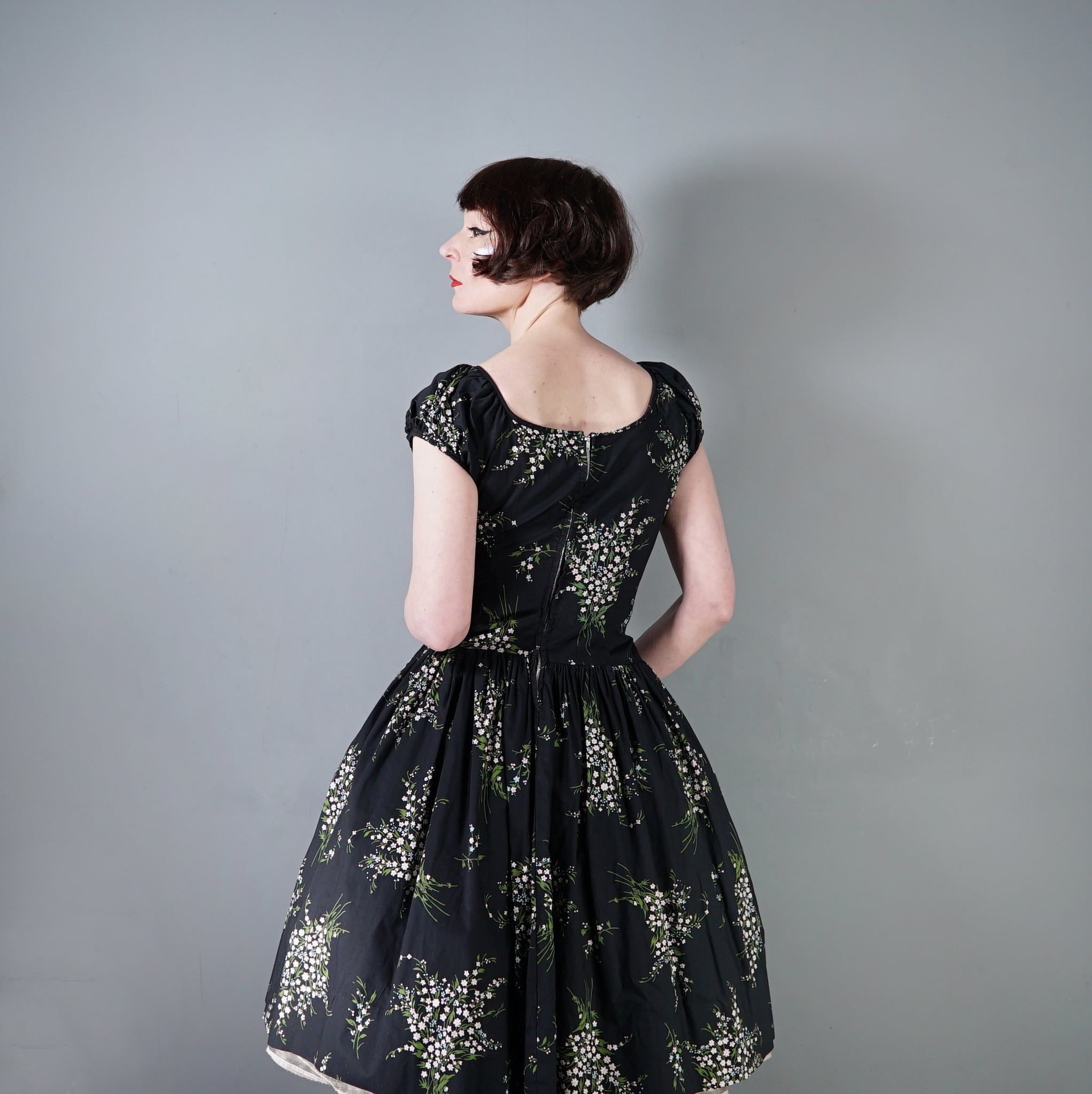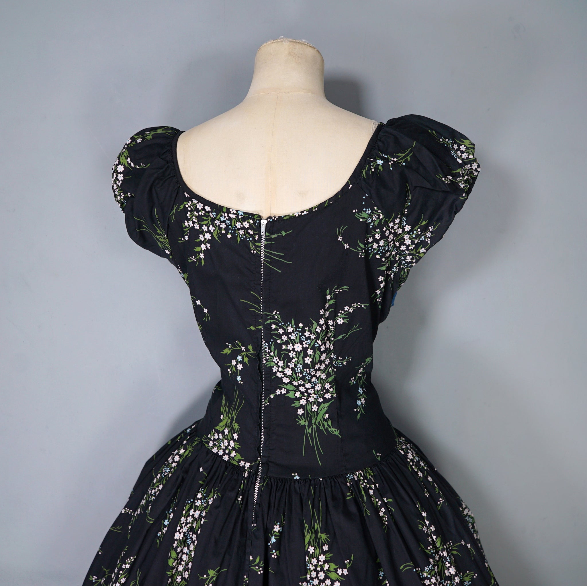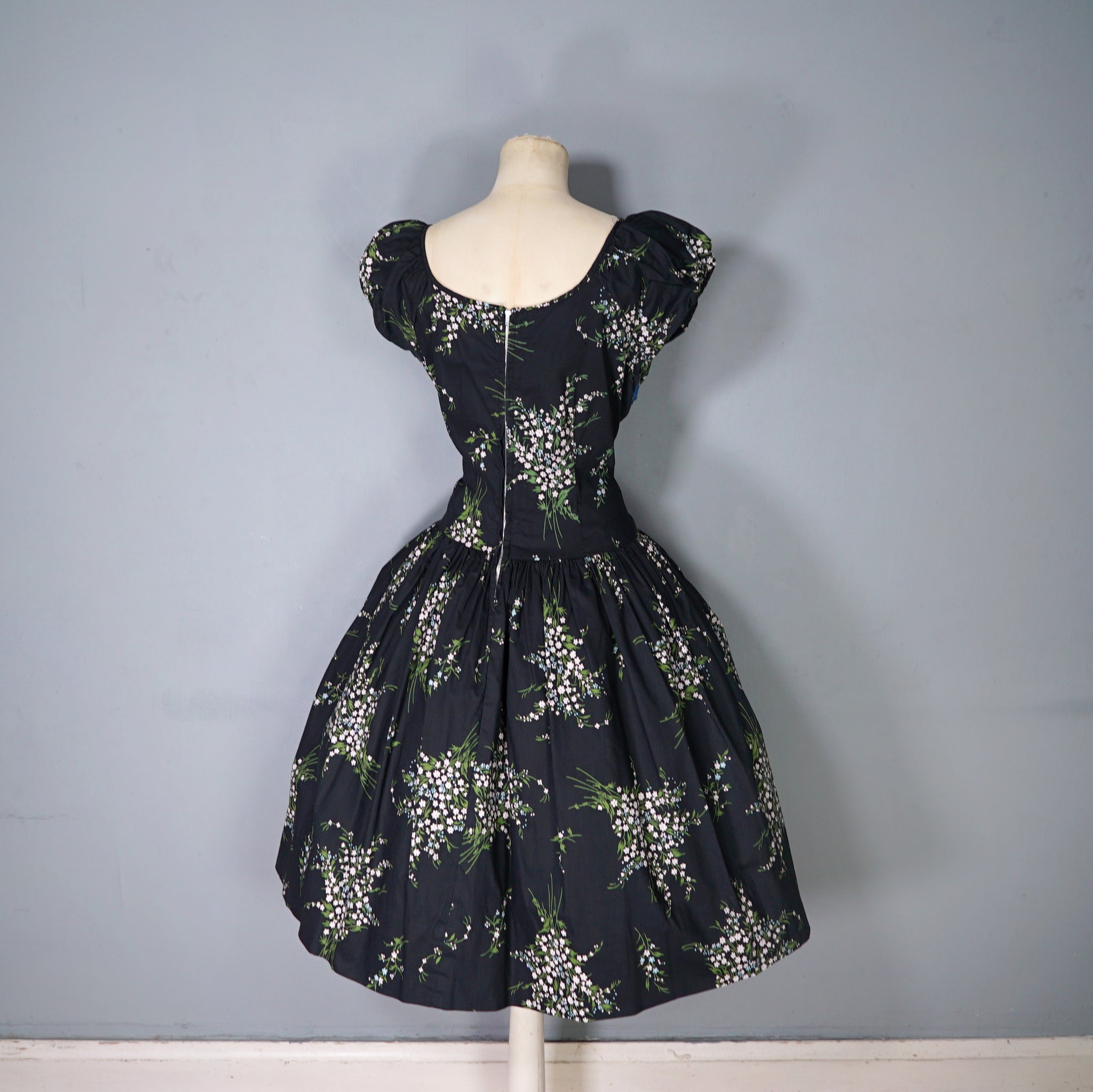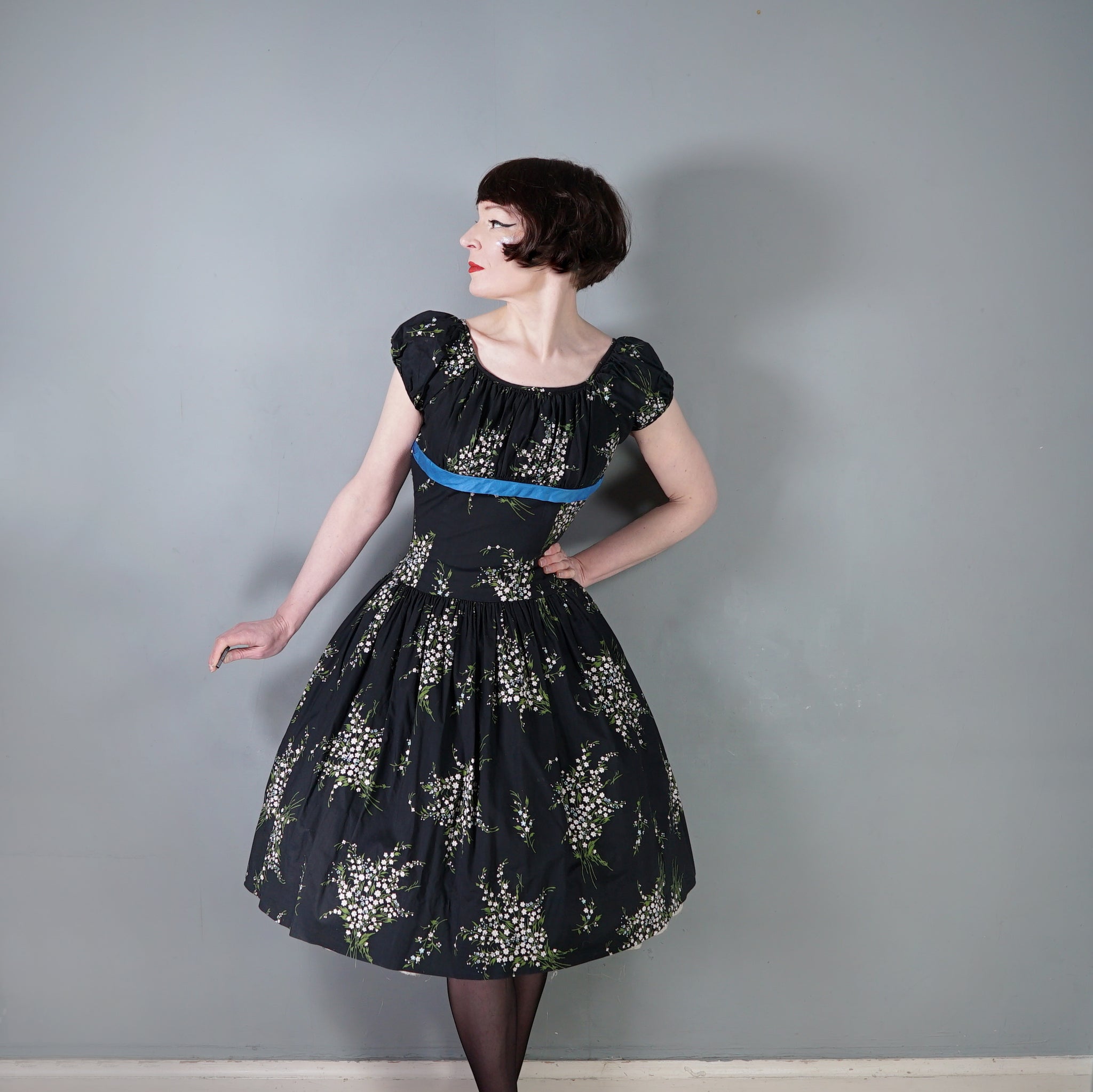 Wonderful 50s dark floral cotton dress by Betty Lo. Somewhere inbetween a day dress and a party dress, in a scattered floral print of small white flower bunches. Elegant silhouette with a high empire bust with soft gathers for a flattering fullness. This is finished with a blue cotton sateen underbust band. Short slightly puffed sleeve and a scooped U-neckline. Drop waisted bodice with a full skirt that falls in lavish gathers from the upper hip down with a generous midi length and swishy full sweep. Back metal zipper to fasten. Dress is unlined.