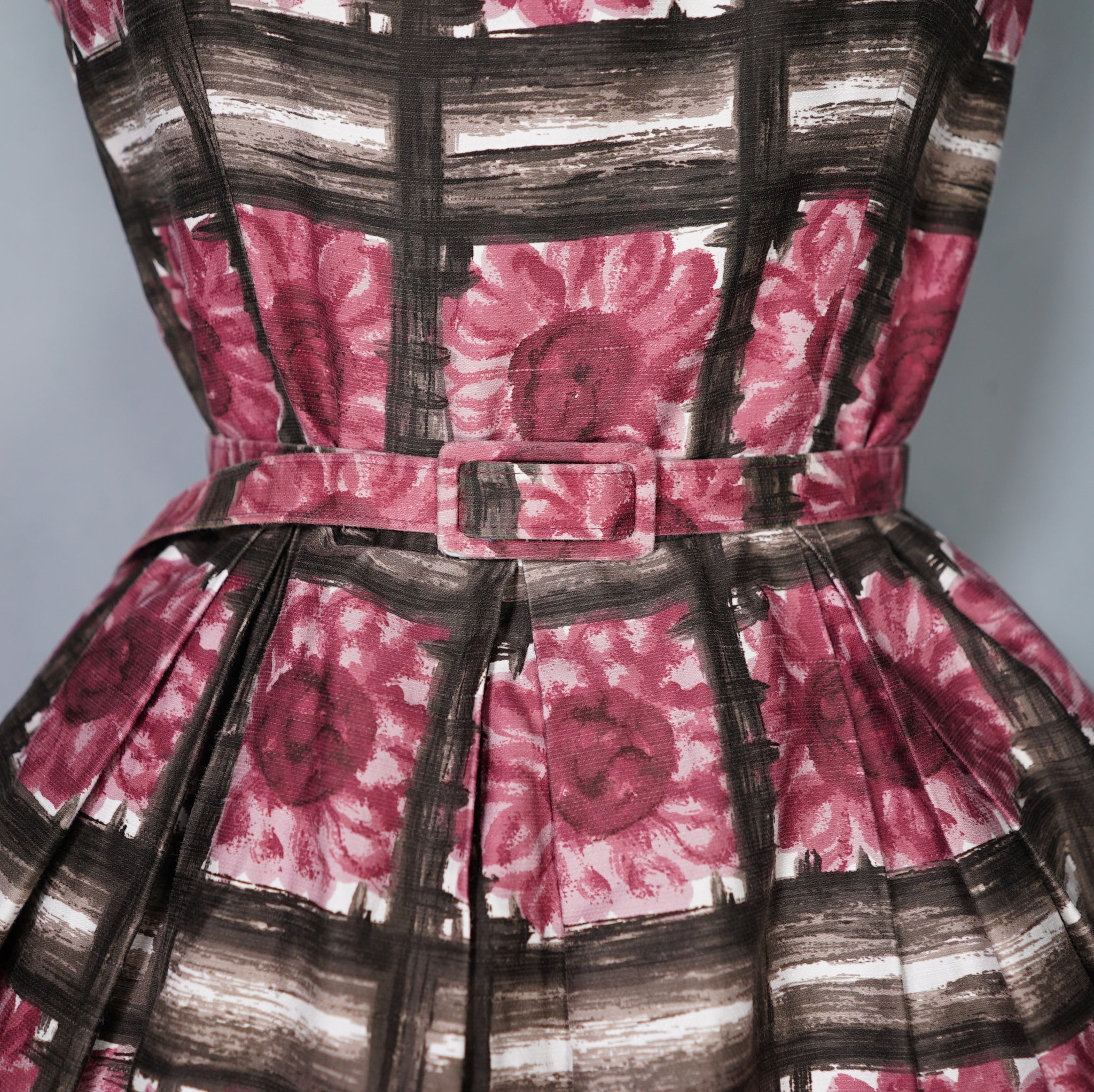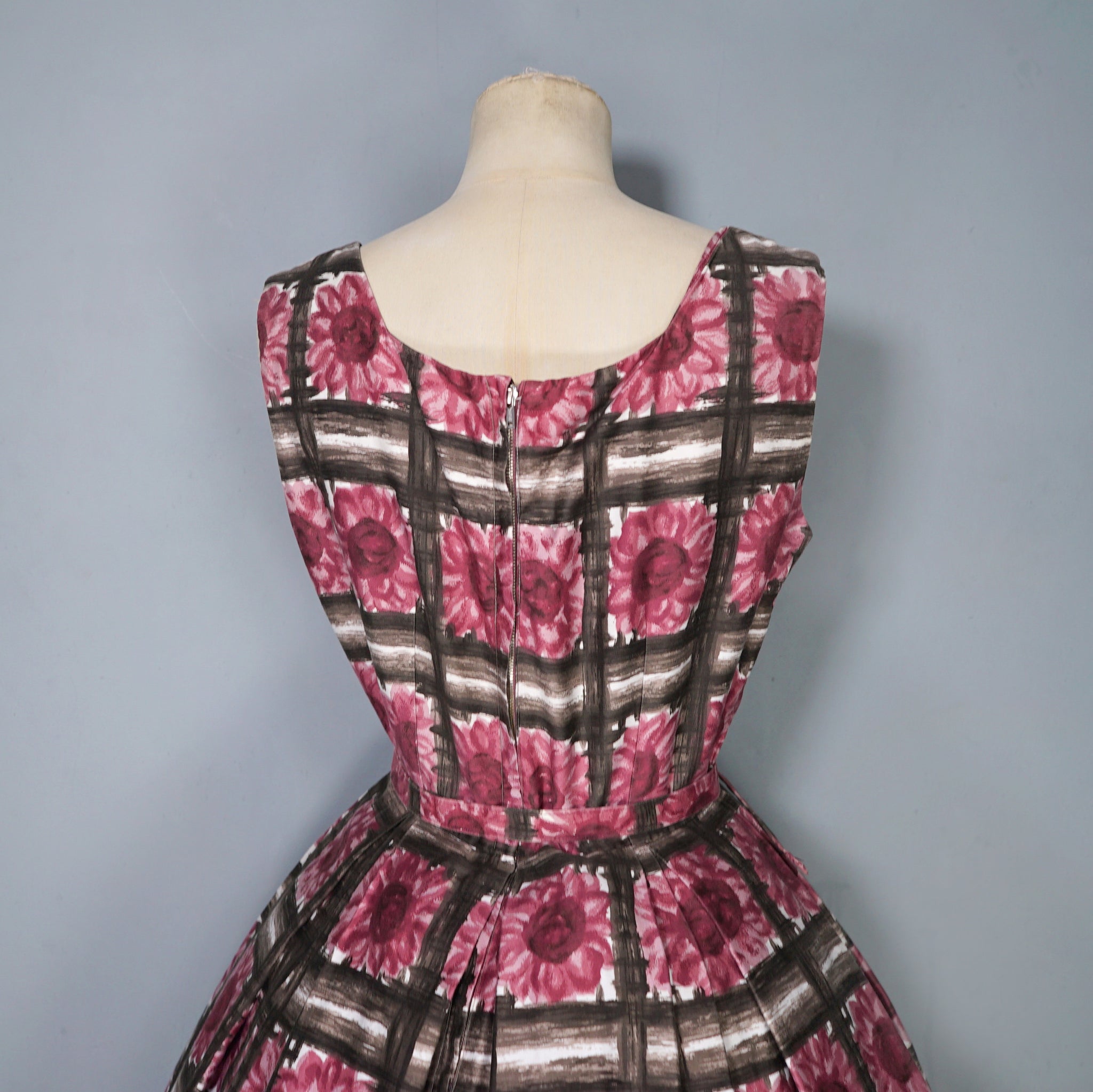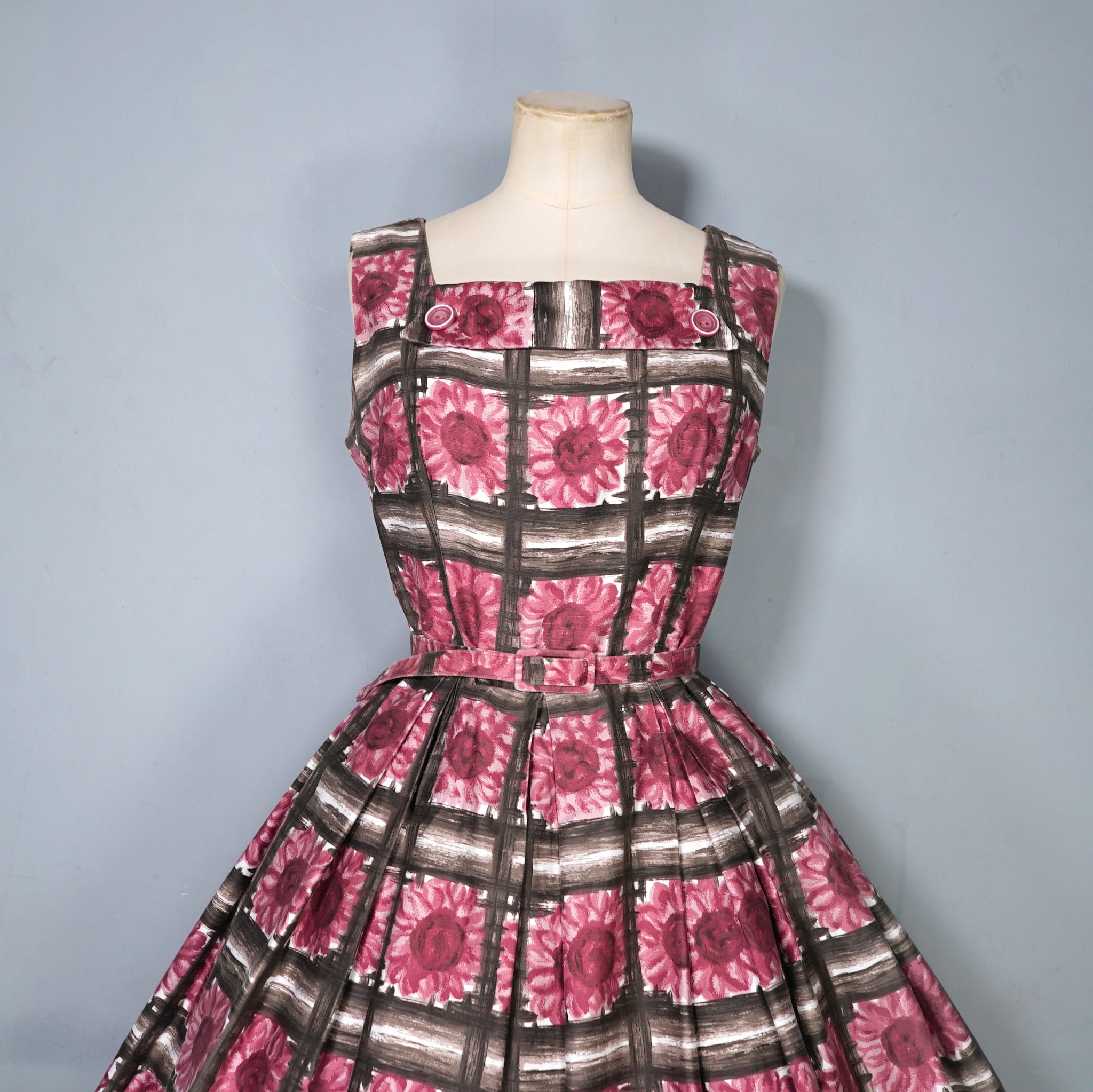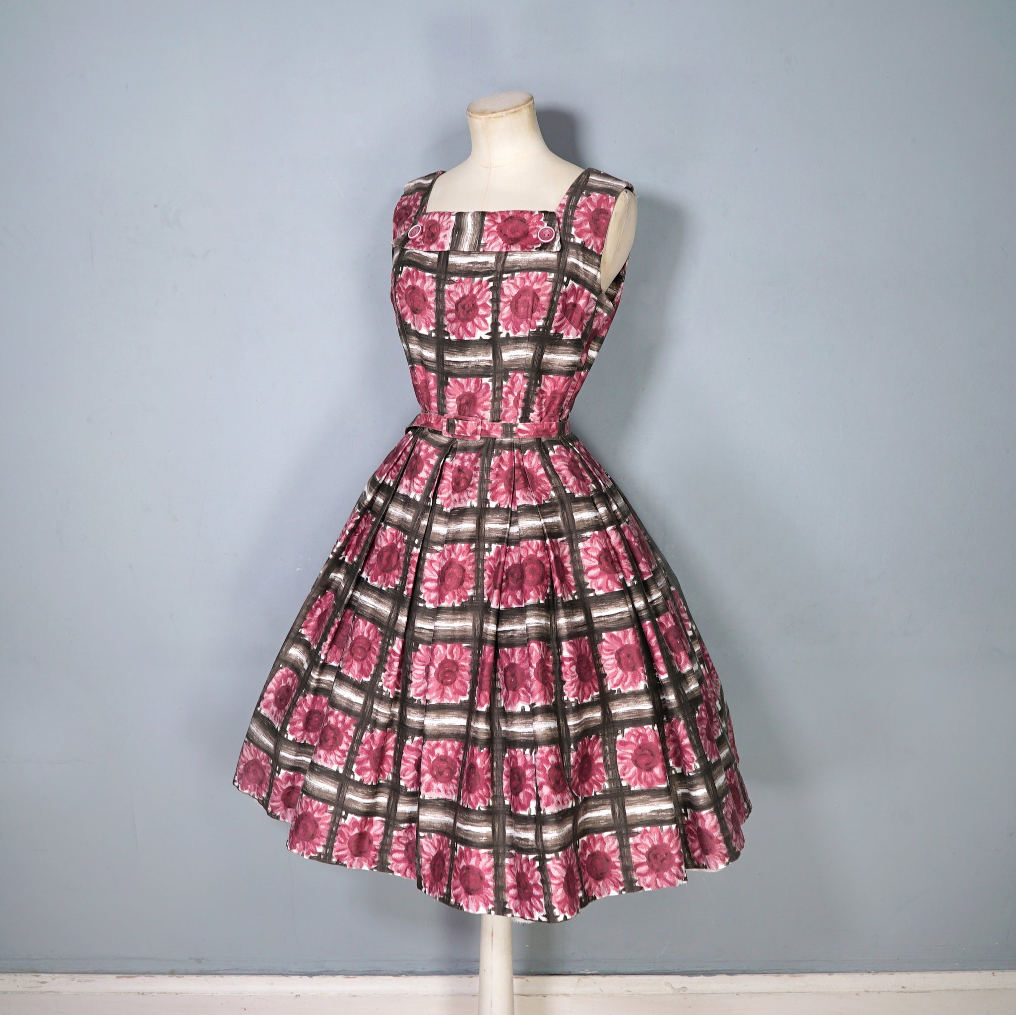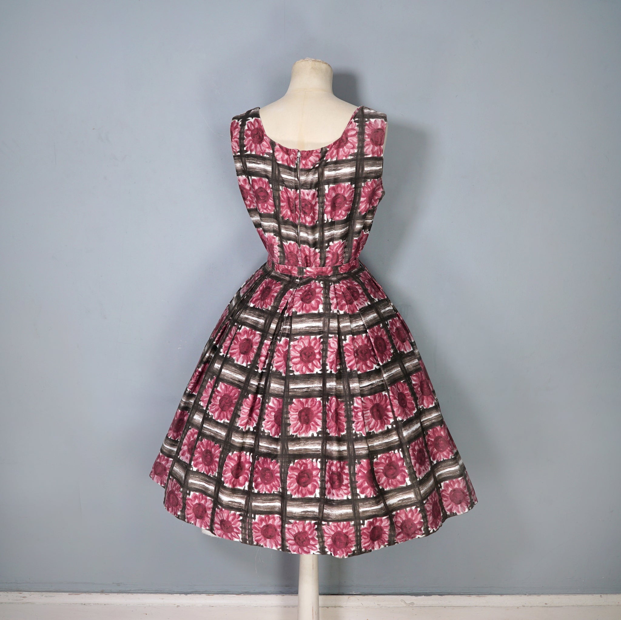 Sharp little 60s dark floral by Irish label Ascot Model. Dark brown and white grid print in painterly strokes with warm dusky pink sun flower florals. Fitted sleeveless bodice with square neck with small folded collar with buttoned corners. Fitted waist with matching belt. Full skirt sewn in wide box pleats. Back metal zipper to fasten. Crisp medium weight cotton.
