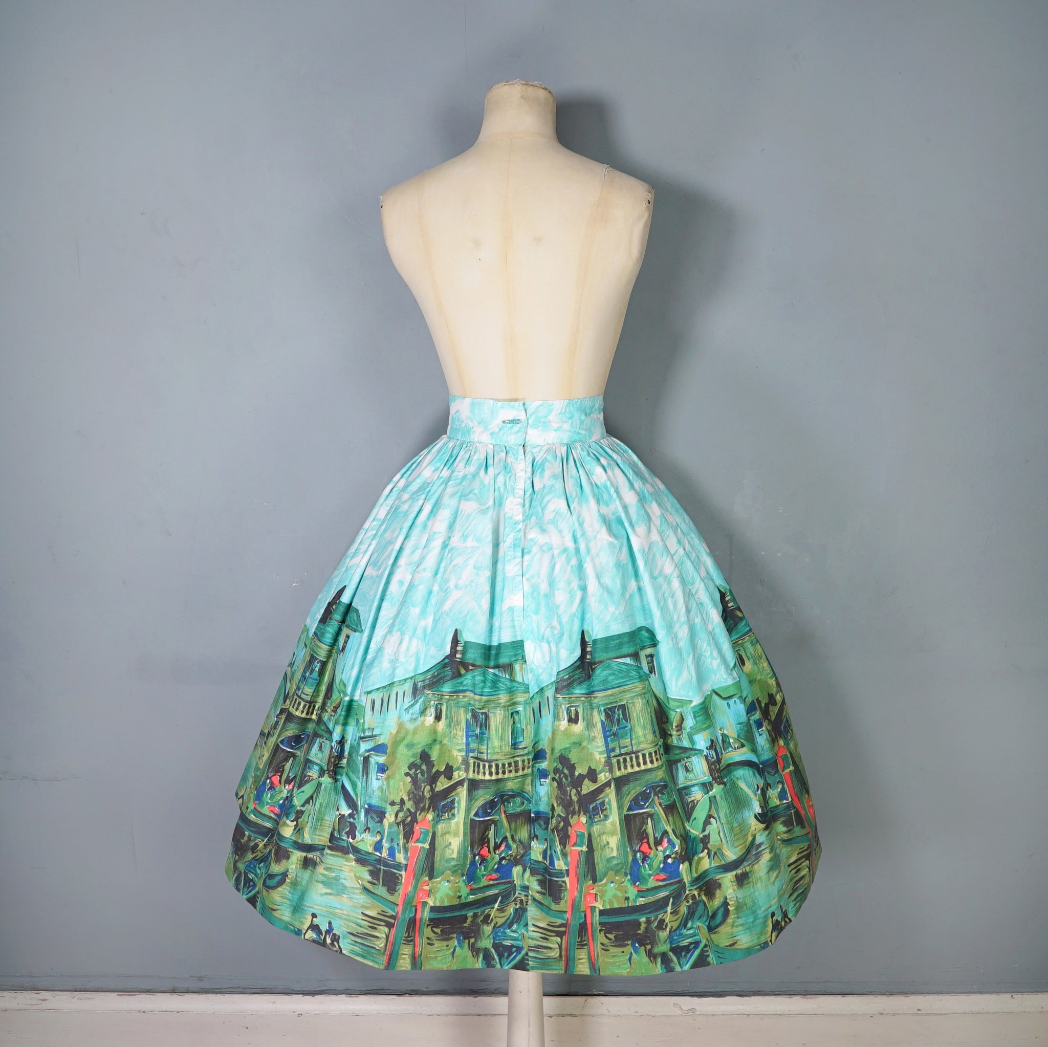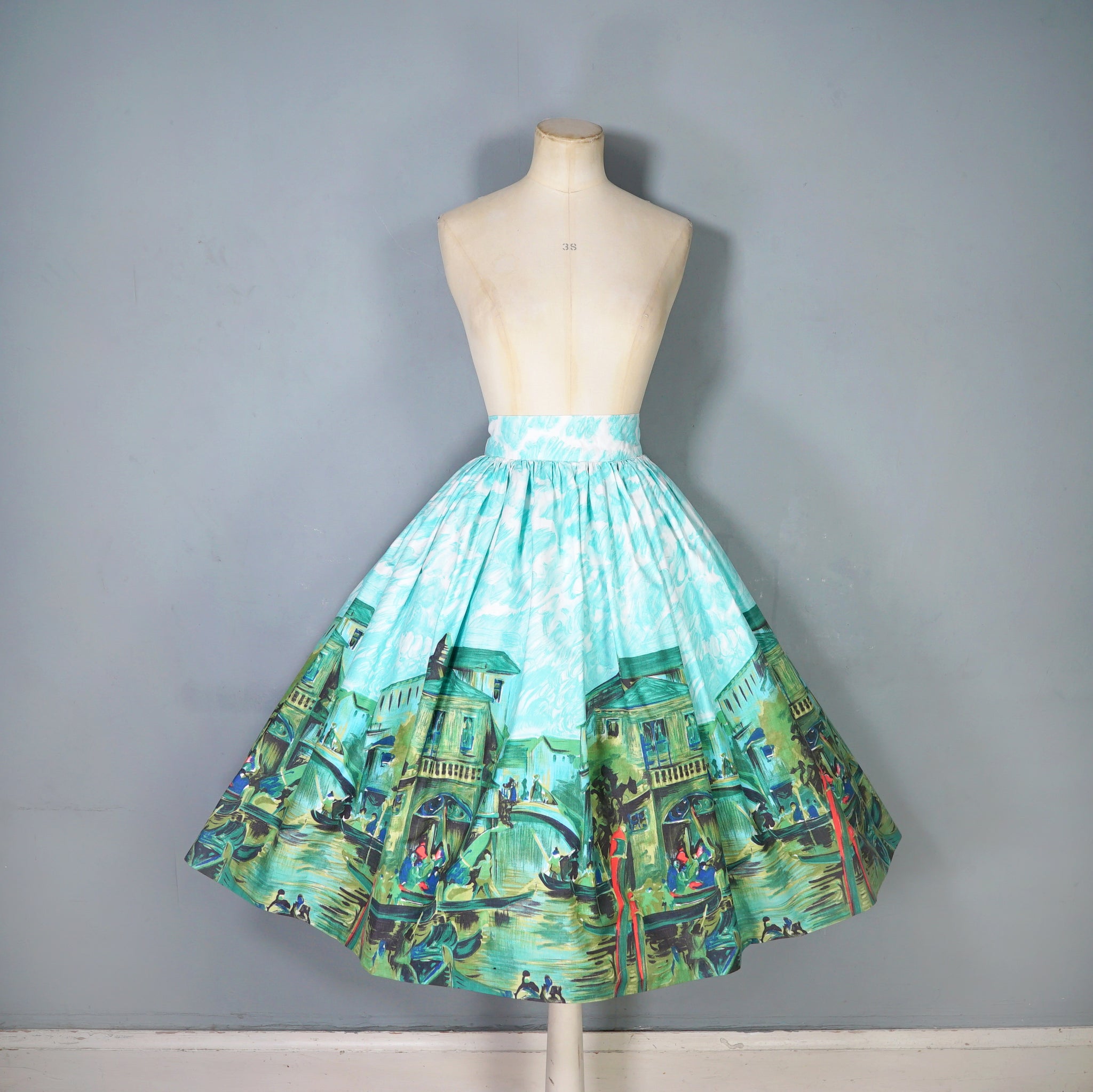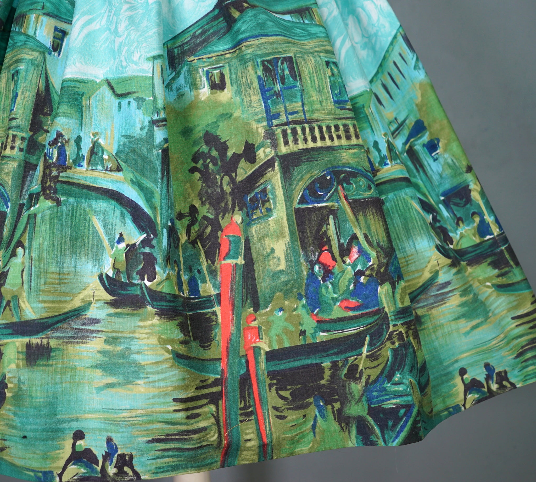 Fantatic 50s cotton novelty full skirt in a painterly scenic border print of what looks like a historical Venice scen. Deep shades of green and black, contrasted with a sky in white and light blue and highlights of red and navy with almost impressionist brushstrokes. High wide fitted waistband with clear plastic button and metal zip to fasten. Very full fit with generous midi length.