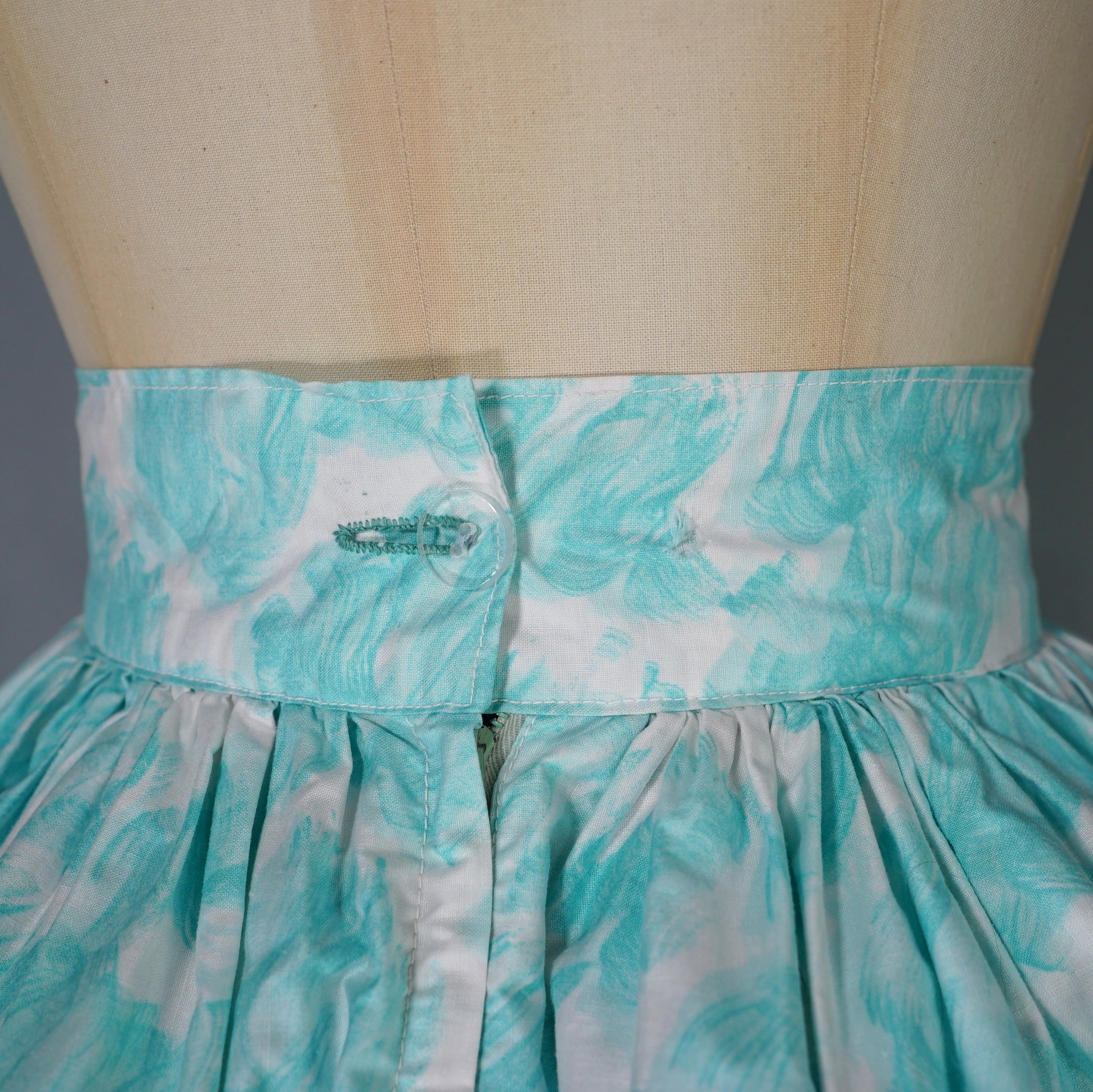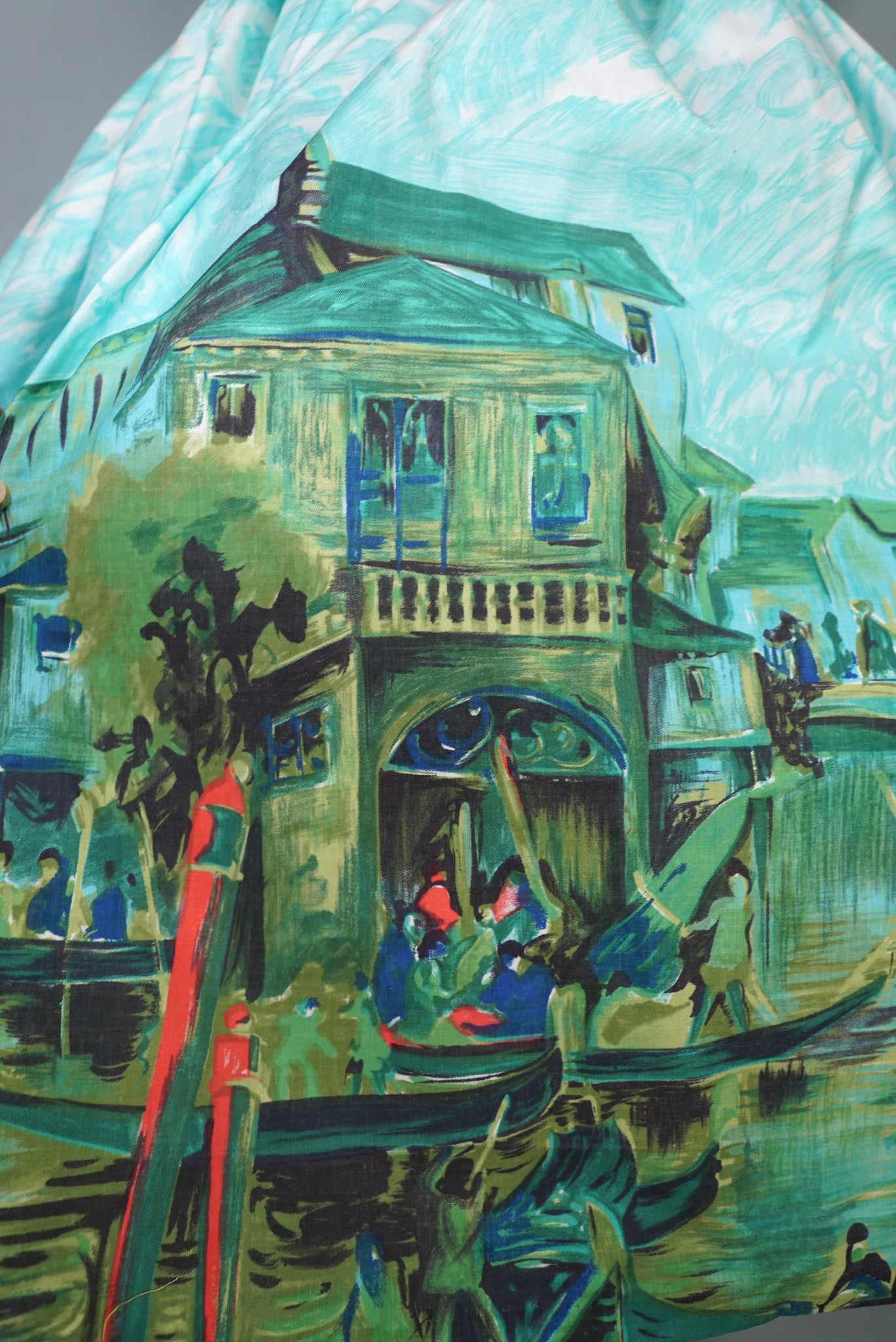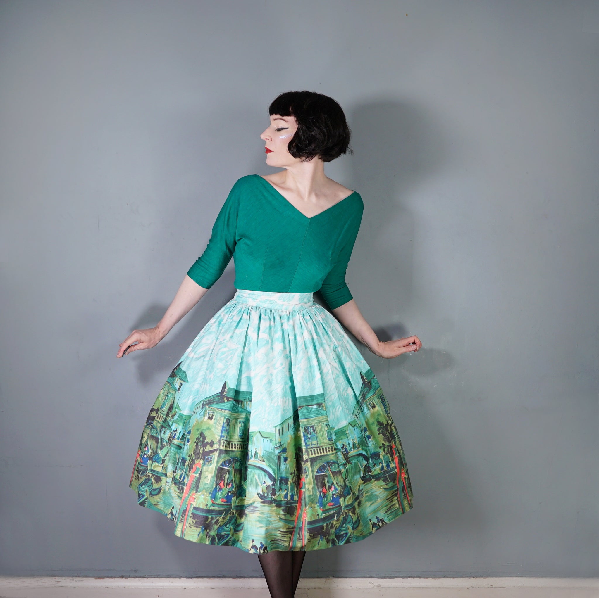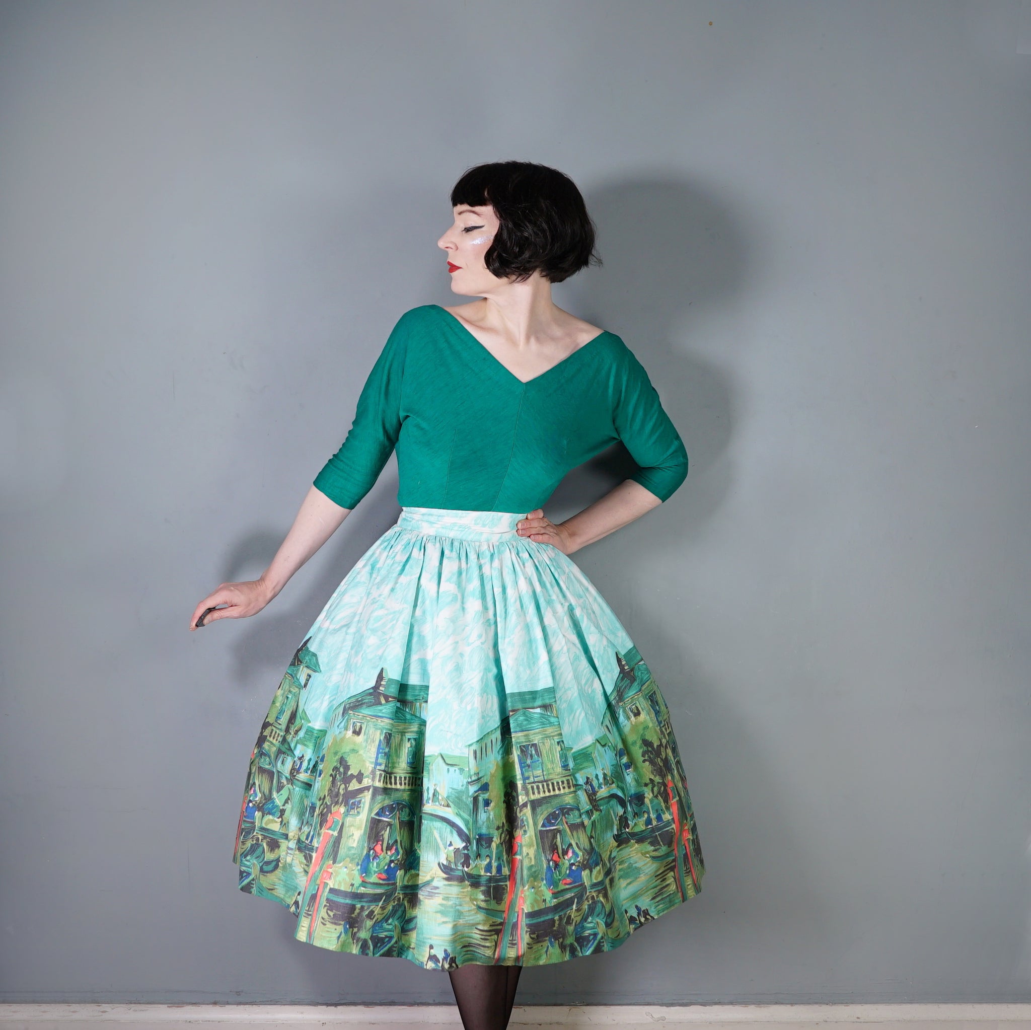 Fantatic 50s cotton novelty full skirt in a painterly scenic border print of what looks like a historical Venice scen. Deep shades of green and black, contrasted with a sky in white and light blue and highlights of red and navy with almost impressionist brushstrokes. High wide fitted waistband with clear plastic button and metal zip to fasten. Very full fit with generous midi length.
