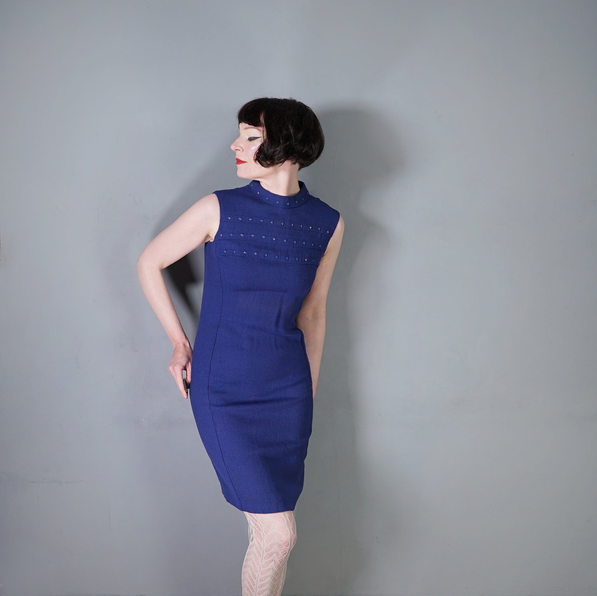 Chic little 60s shift dress by Carnegie. Deep blue colour in a soft linen-like woven fabric. Horizontal tucks across the bustline studded with small square blue metal studs and matching design to the high collarless neckline. Sleeveless fit with elegant shift shape and shorter length. Unlined. Back metal zip to fasten.